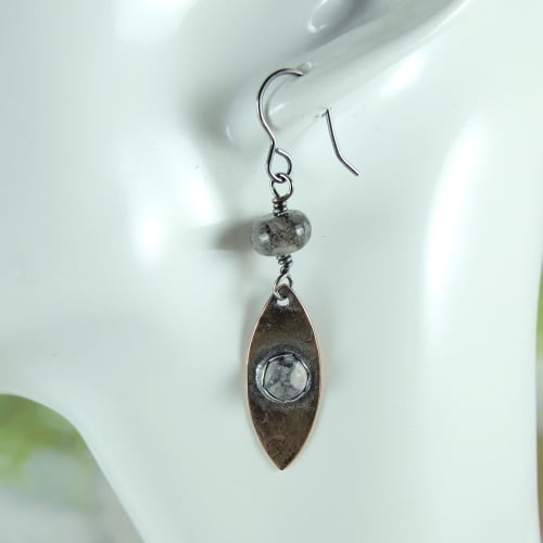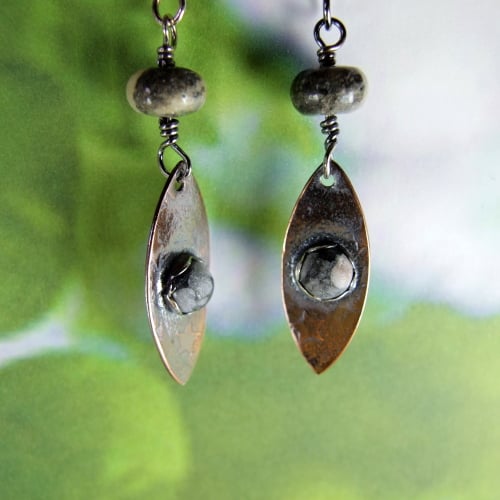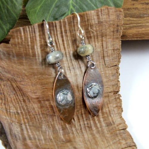 Sterling Silver, Jasper and Patterned Copper Leaf Earrings.