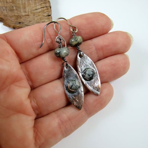 I have created the leaf shapes from copper sheet, hand cut and textured with a pattern then added a small bezel which holds a 5mm Fossil Jasper Gemstone. Paired with Jasper beads and sterling silver fittings and ear hooks. The earrings have been given an oxidised finish.