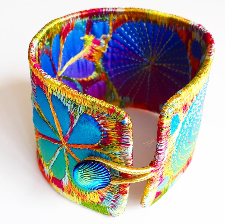 This is a handmade machine stitched fabric Stiched Silk Cuff or bracelet.