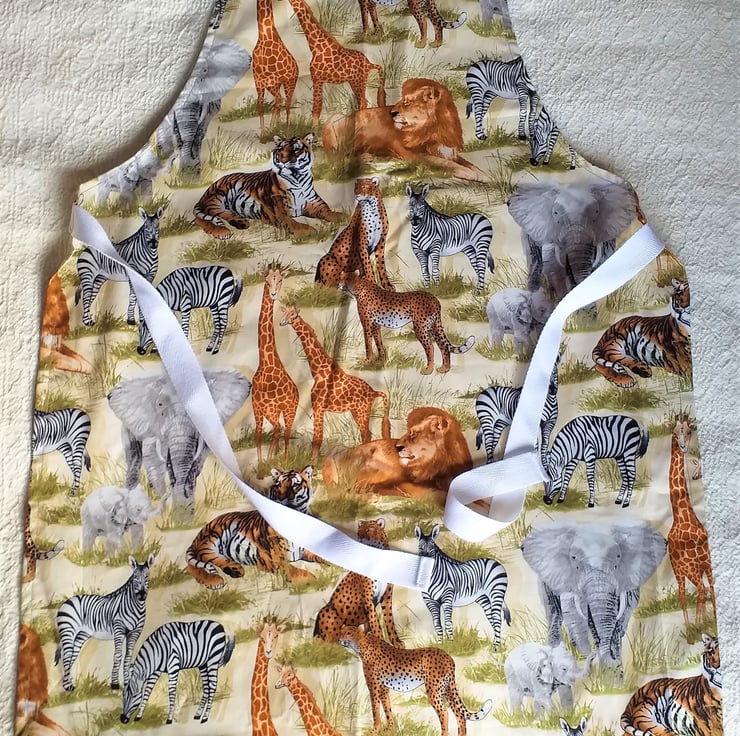 I have made this lovely adult pinafore from beautiful good quality cotton, covered in realistic illustrations of large wild animals, elephants, giraffes, zebras, and three species of big cat, the lion, tiger and cheetah. The animals may not appear in the same place as in the illustrations.