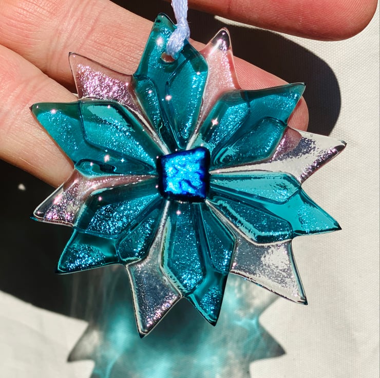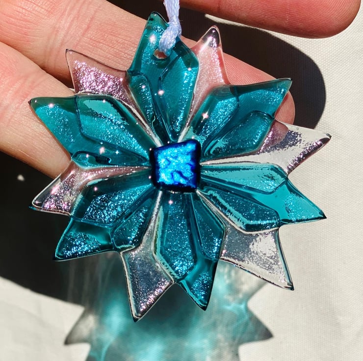 Gorgeous fused glass Christmas snowflake in gorgeous turquoise transparent glass. The glass decorations are created by cutting sheet art glass and fusing in my kiln . The snowflake flowers are made using 3 layers the top one being dichroic glass for extra sparkle. The really reflect the light beautifully on your Christmas tree . The decorations are approximately 3 inch diameter Drilled and strung with ribbon. Perfect for your Christmas tree, or as a gift .