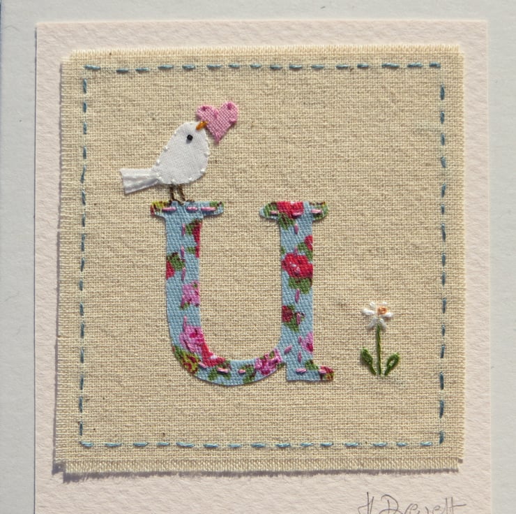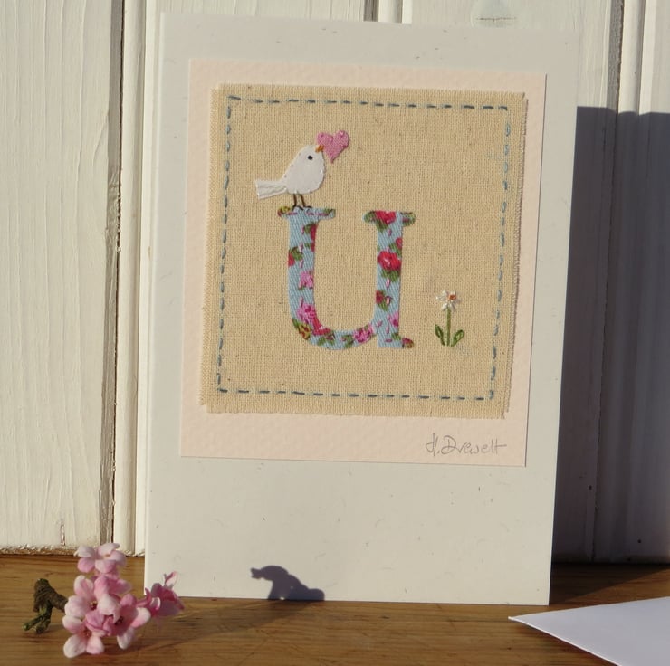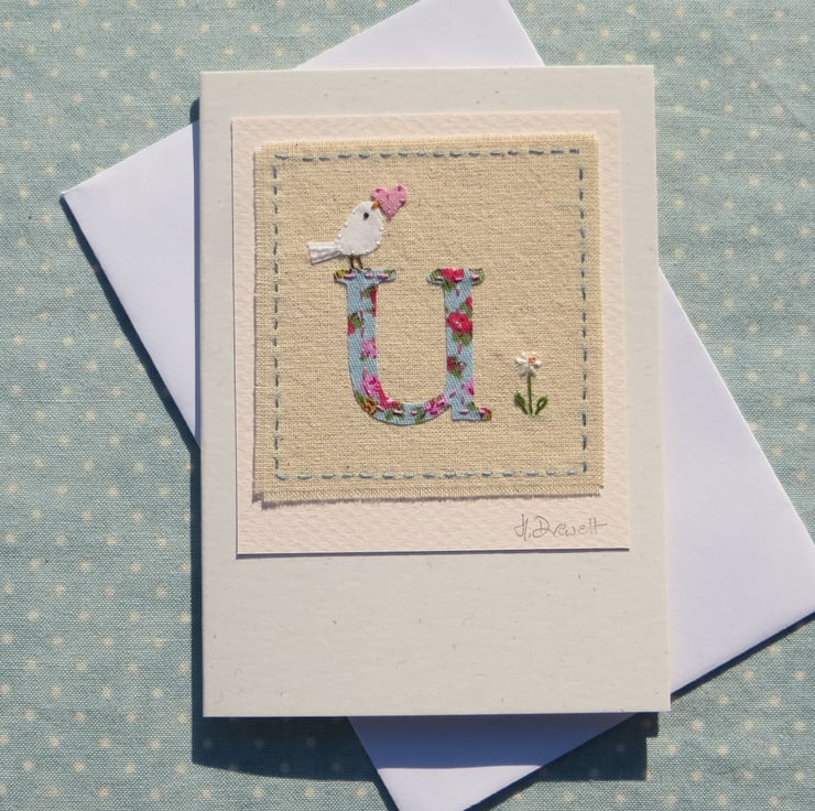 A hand-stitched card with the letter 'U' cut from pretty floral fabric stitched into place with tiny stitches. I have added a miniature applique dove with heart in her beak, and then embroidered a tiny daisy flower to complete the design.