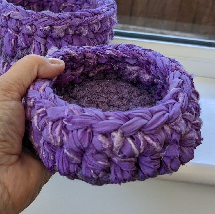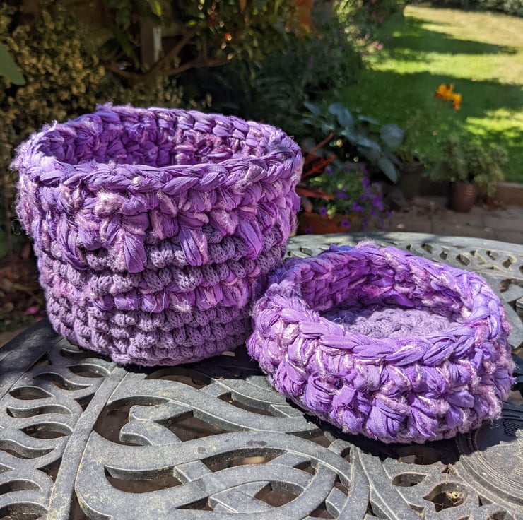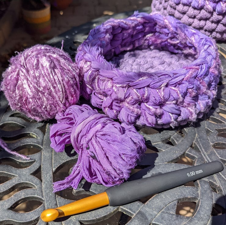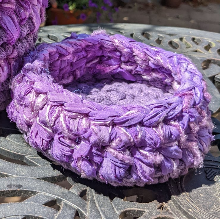 A small crocheted container made with a mixture of recycled yarns including, premium cotton braided cord, sari silk chiffon ribbon and banana yarn, all in shades of purple.