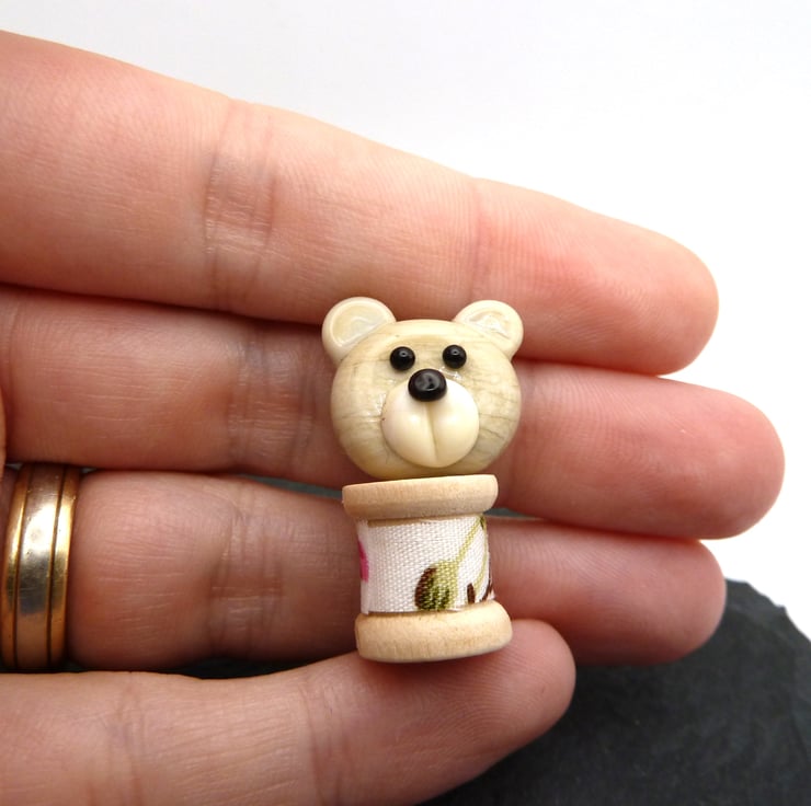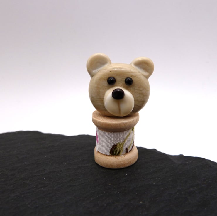 A wooden spool wrapped with fabric, it features a handmade lampwork glass teddy bear head on the top.