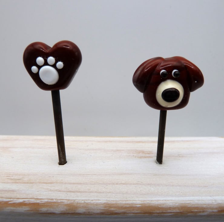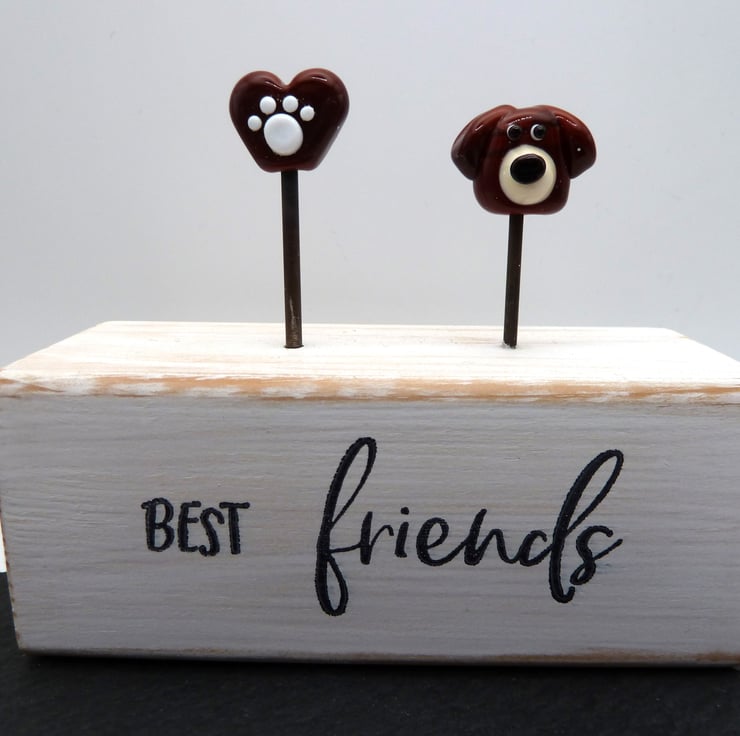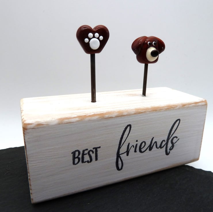 A wooden block which has been painted and given a rustic finish, it features a handmade glass dog head and heart which features a paw print. The glass items have been handmade by myself.