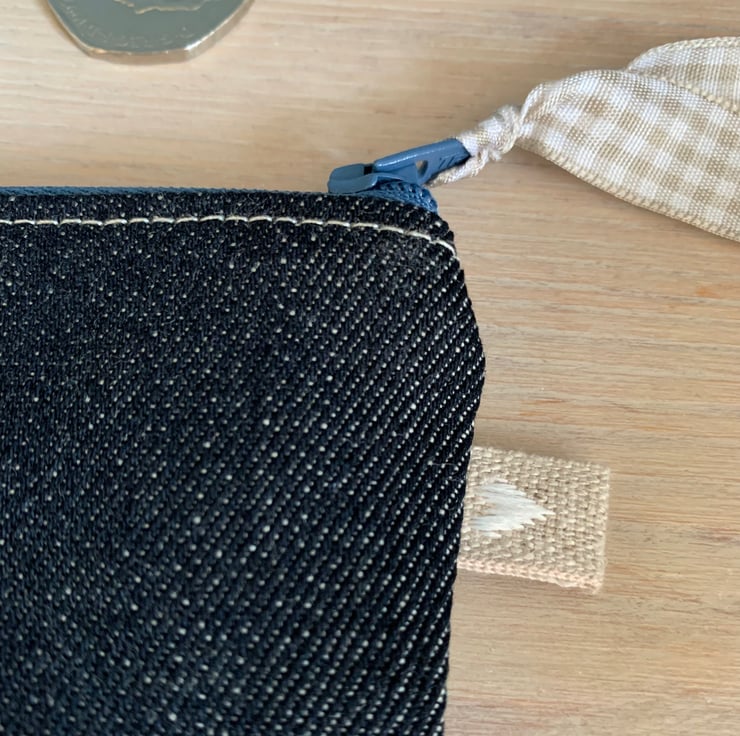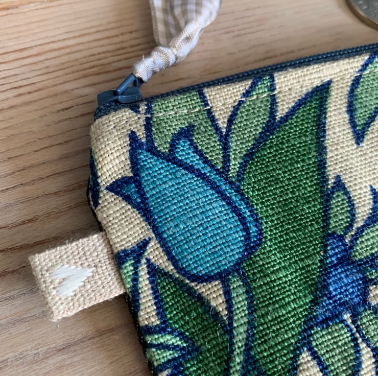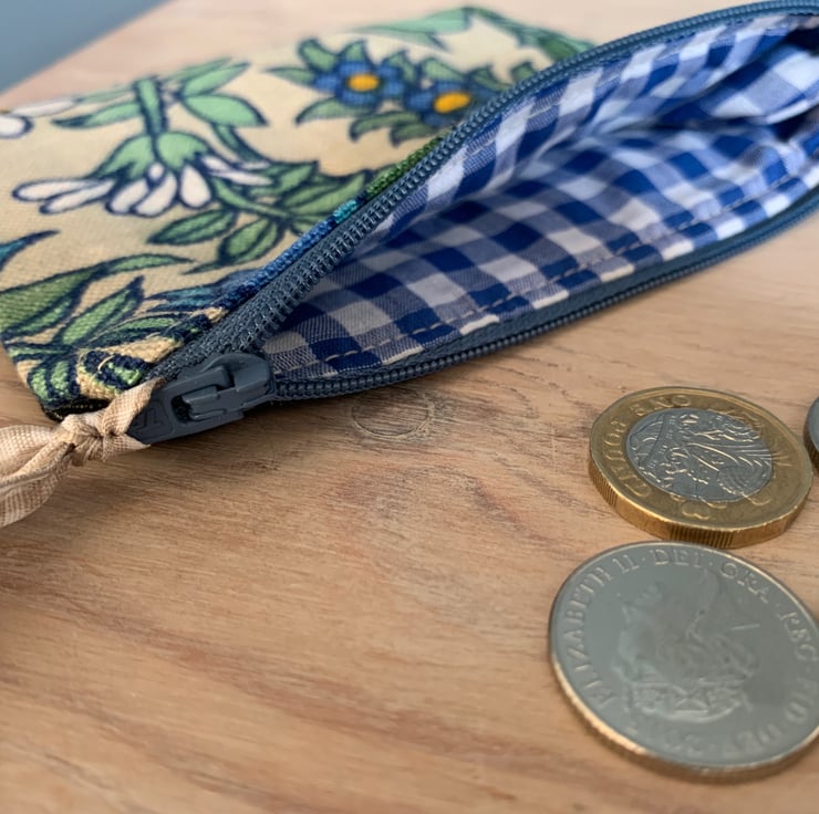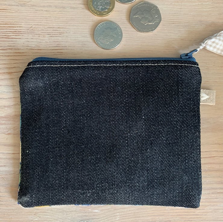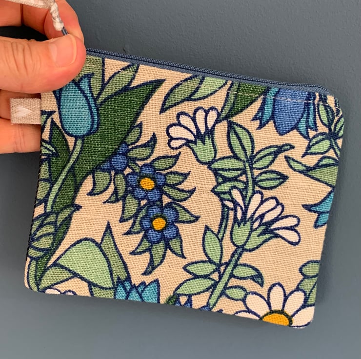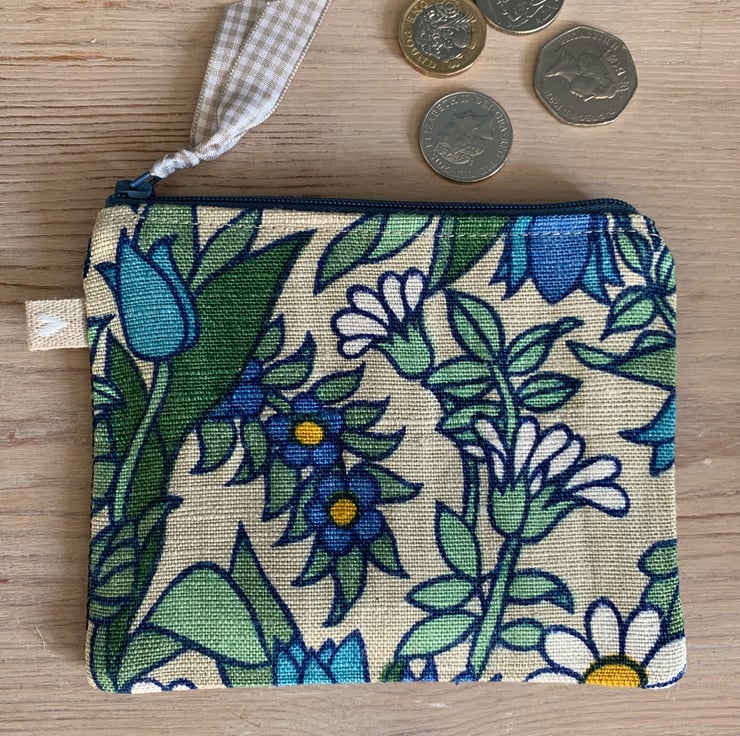 Cute little coin purse made from vintage Flower Waltz linen-mix fabric backed with dark denim. Flower Waltz was designed by Pat Albeck for Jonelle in the 1960s/70s. It is lined with blue and white gingham.