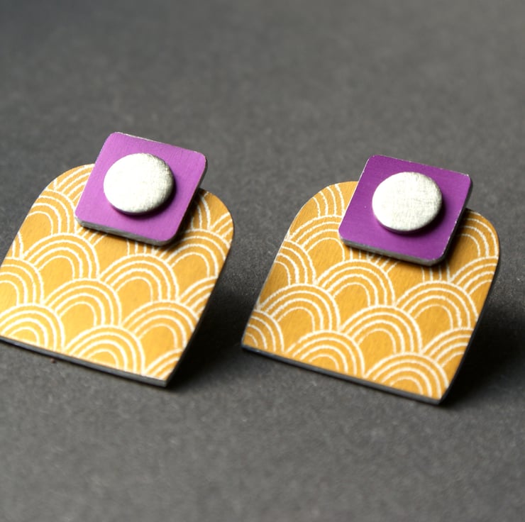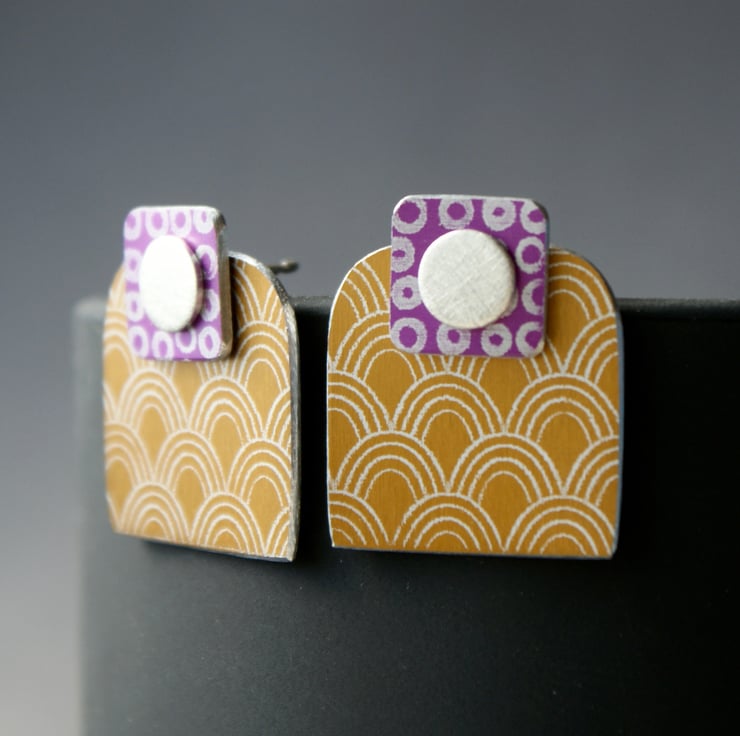 A quirky pair of earrings that can be worn in a number of ways. They are made up of 3 parts, a sterling silver circle stud, a small coloured square and a larger rounded square. These are hand crafted from anodised aluminium and are patterned on one side and plain on the other.