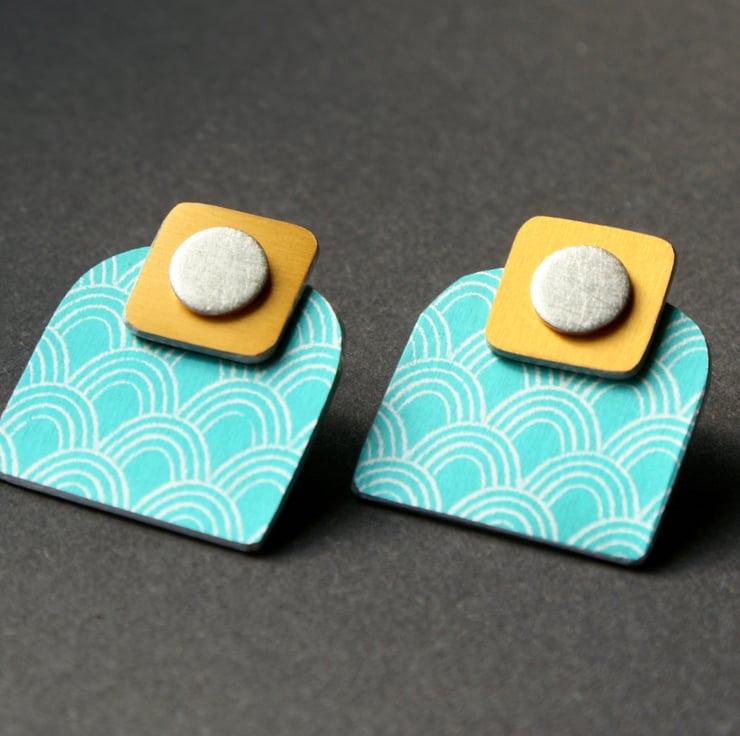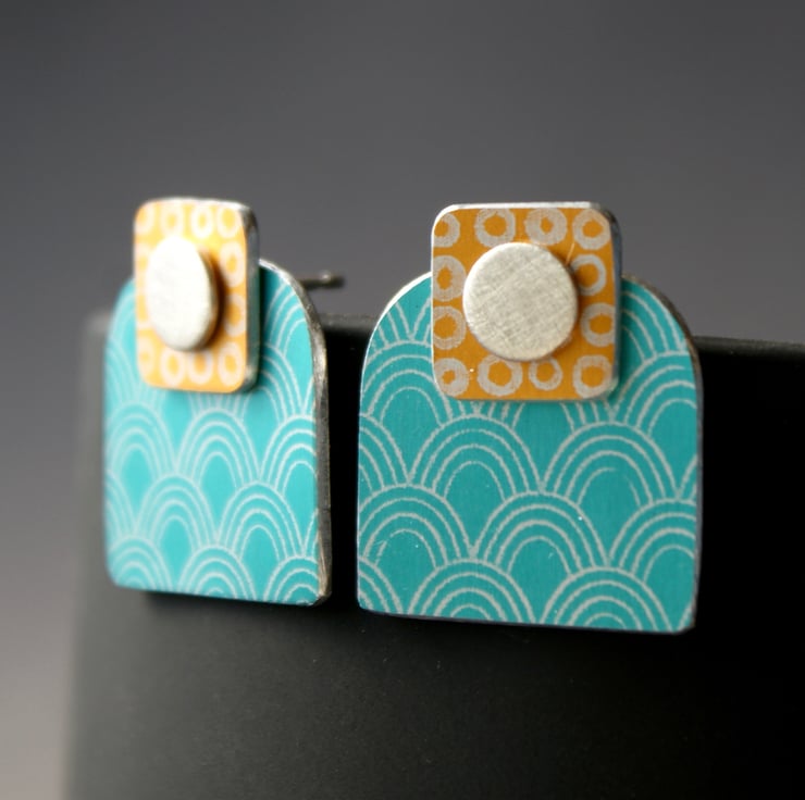 A quirky pair of earrings that can be worn in a number of ways. They are made up of 3 parts, a sterling silver circle stud, a small coloured square and a larger rounded square. These are hand crafted from anodised aluminium and are patterned on one side and plain on the other.