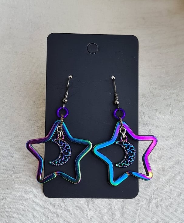 Earring length is approx 6cm long from top of the ear wire to the bottom of the star. Stars are Rainbow tone split rings 3.5cm H x 3.5cm W, but are quite tightly together, please be aware there maybe be a small possibility that your hair may get caught in them. Crescent Moon charms are a similar Rainbow style. Ear wires are Gun Metal tone, if your require alternative ear wires go to the choose Options Box. See pics 3 & 4 for styles available in Sterling.