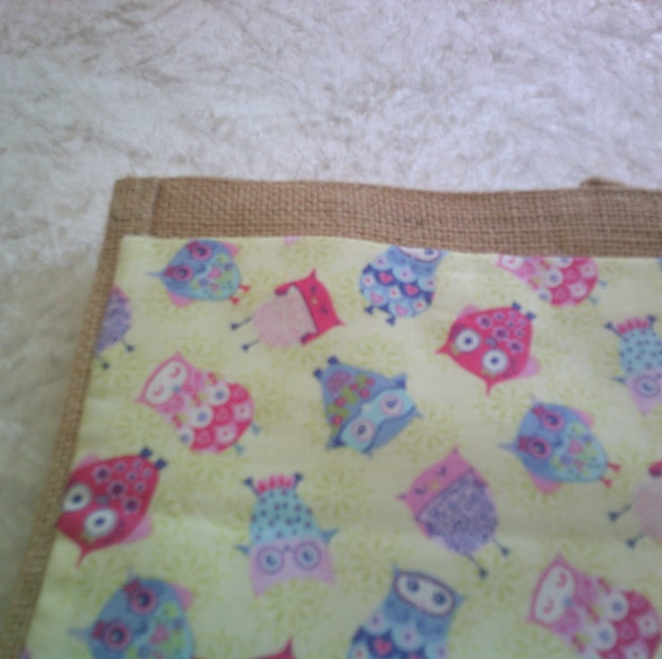 The bag itself measures approximately 22 x 20 x 13 cm (9 x 8 x 5 inches). The fabric pocket - which has been hand sewn onto the bag has a design of Pink and Blue owls on a pale green background.