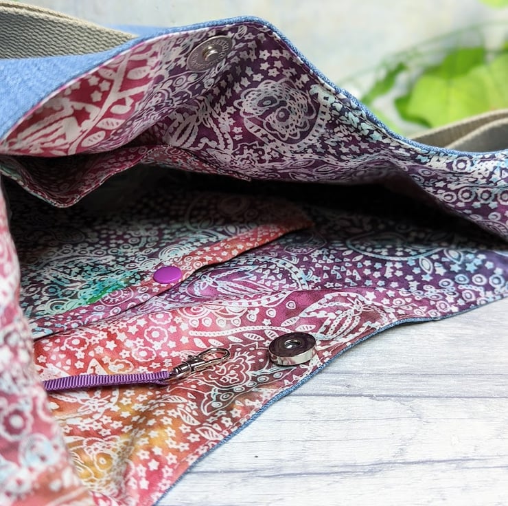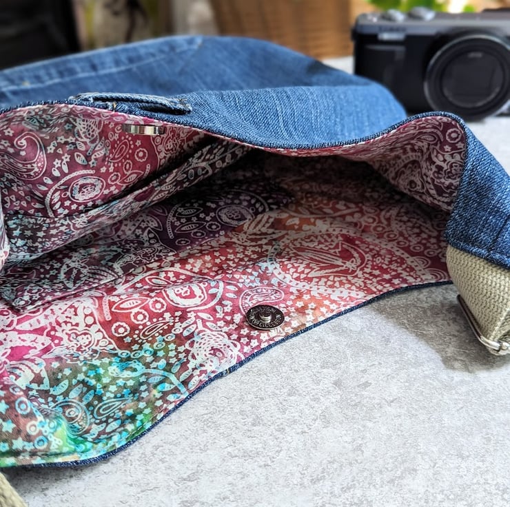 The star and strap colours are carried through with batik print print cotton poplin lining. The cross body strap has been made from 38mm wide light khaki webbing.