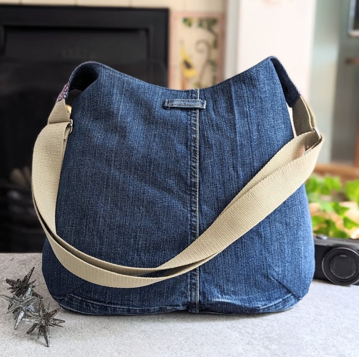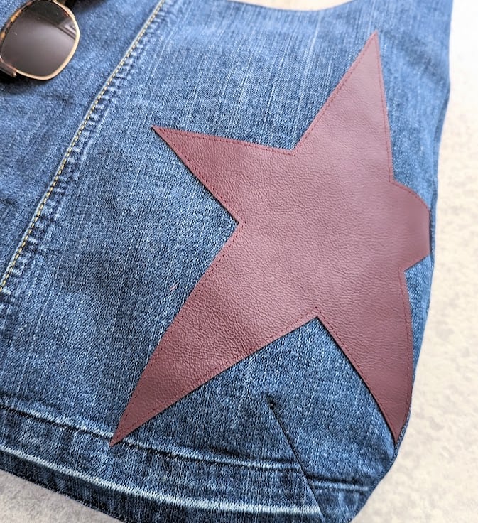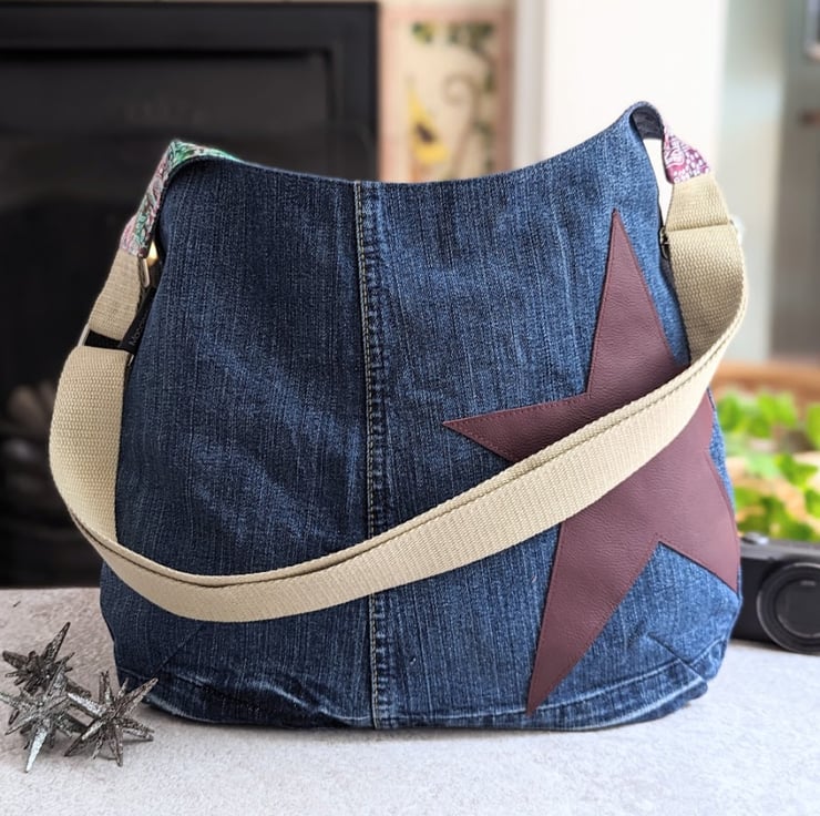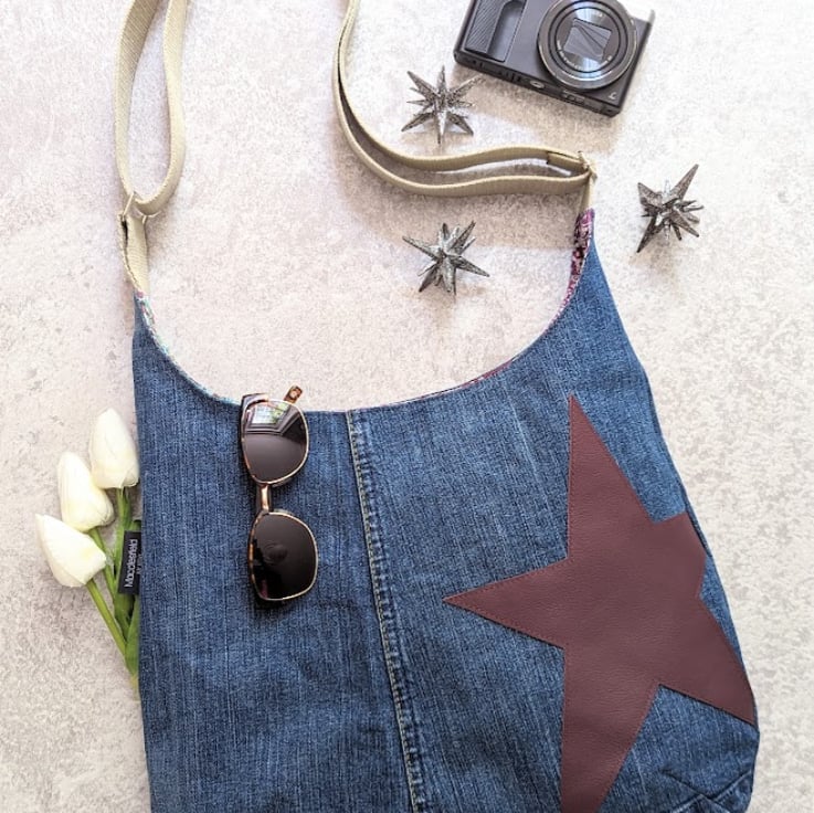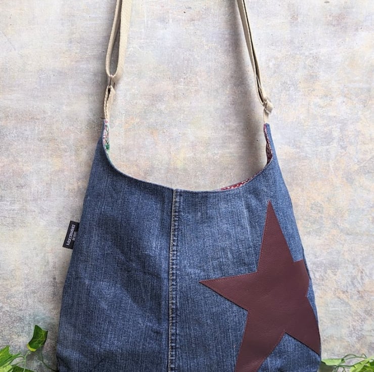 A stylish burgundy leather star and recycled denim make this cross body hobo bag a fashion choice with a statement. It's been designed and handmade using recycled denim jeans and offcut leather pieces. With detailing from the original jeans, dress it up or dress it down, it’s slouchy and perfect for all your everyday essentials and more!