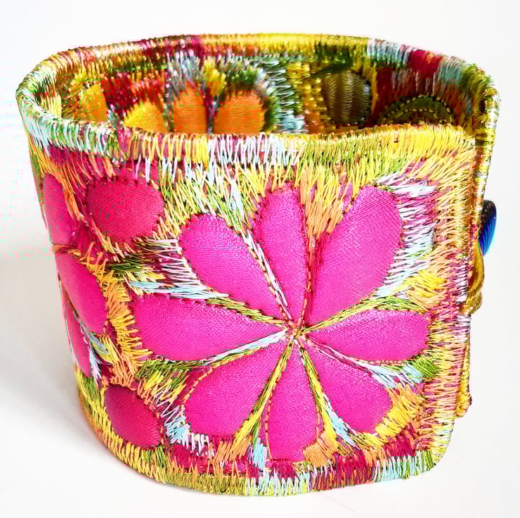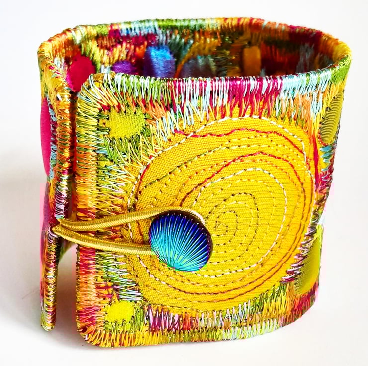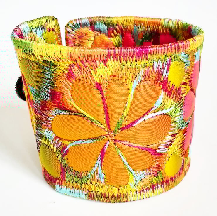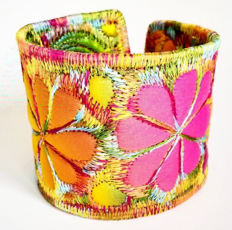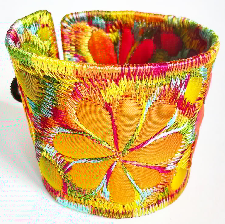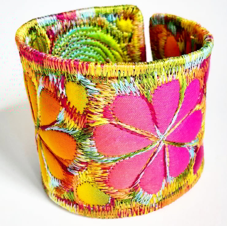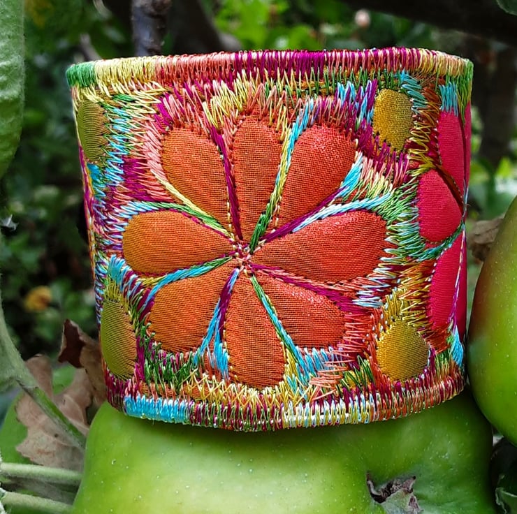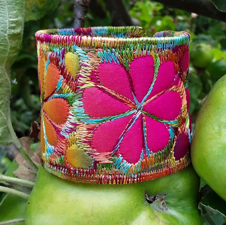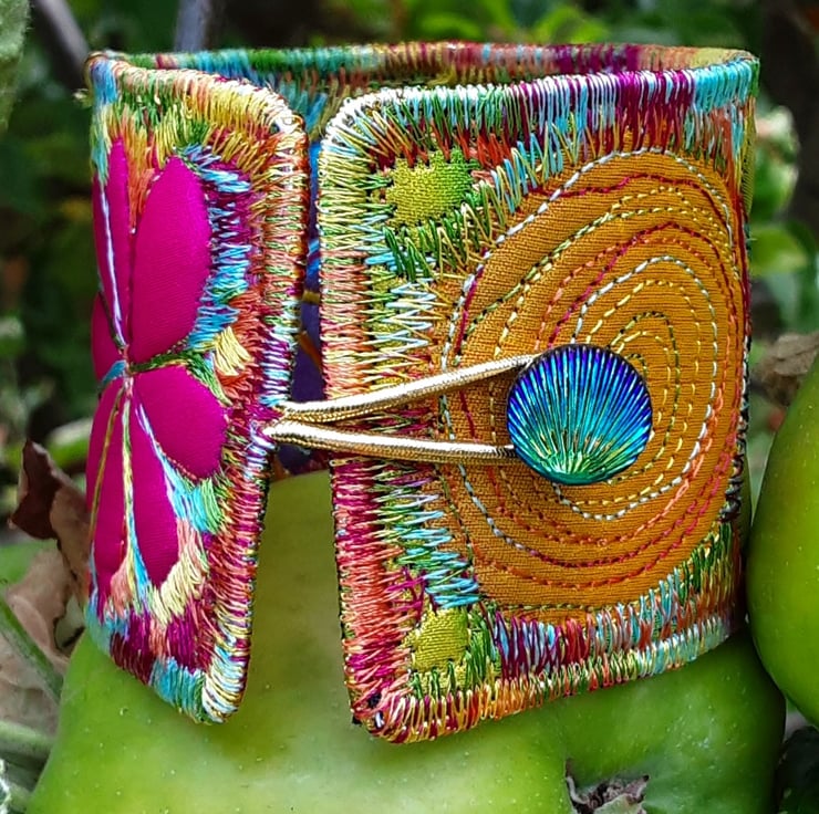 This is a handmade machine stitched fabric Stiched Silk Cuff or bracelet.which changes color as itmoves round.