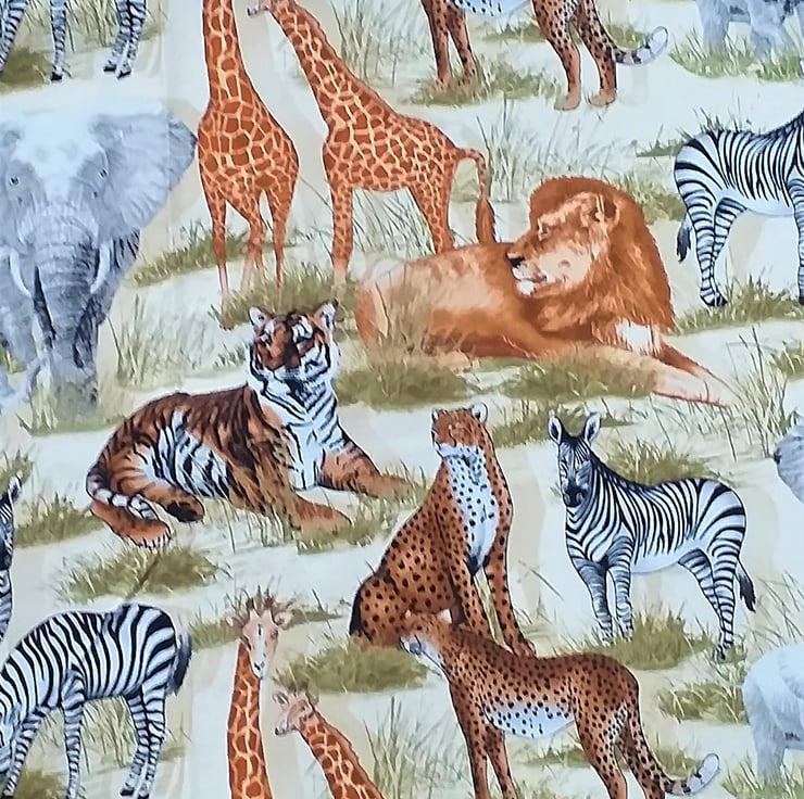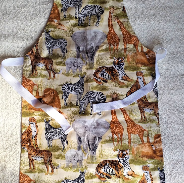 I have made this lovely pinafore from beautiful good quality cotton, covered in realistic illustrations of large wild animals, elephants, giraffes, zebras, and three species of big cat, the lion, tiger and cheetah. The animals may not appear in the same place as in the illustrations.