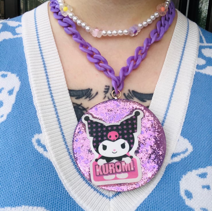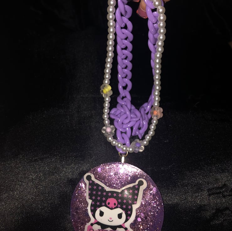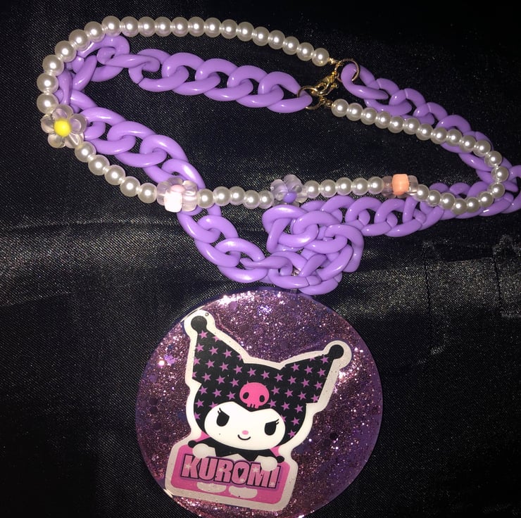 Large handmade kuromi pendant with a gorgeous pearl necklace and purple chain