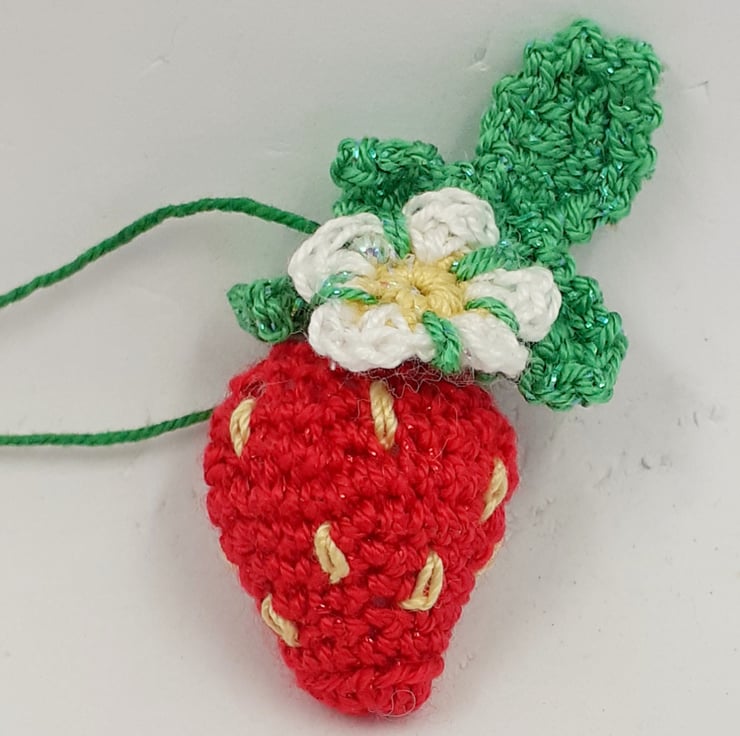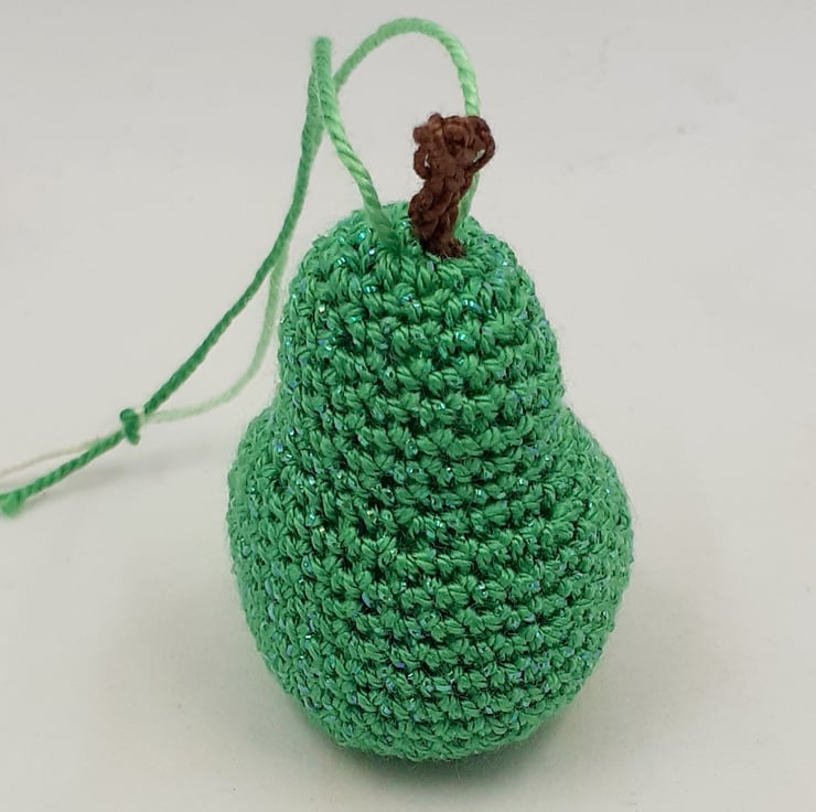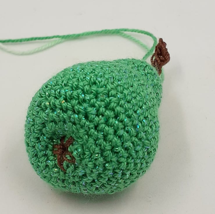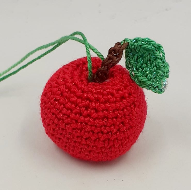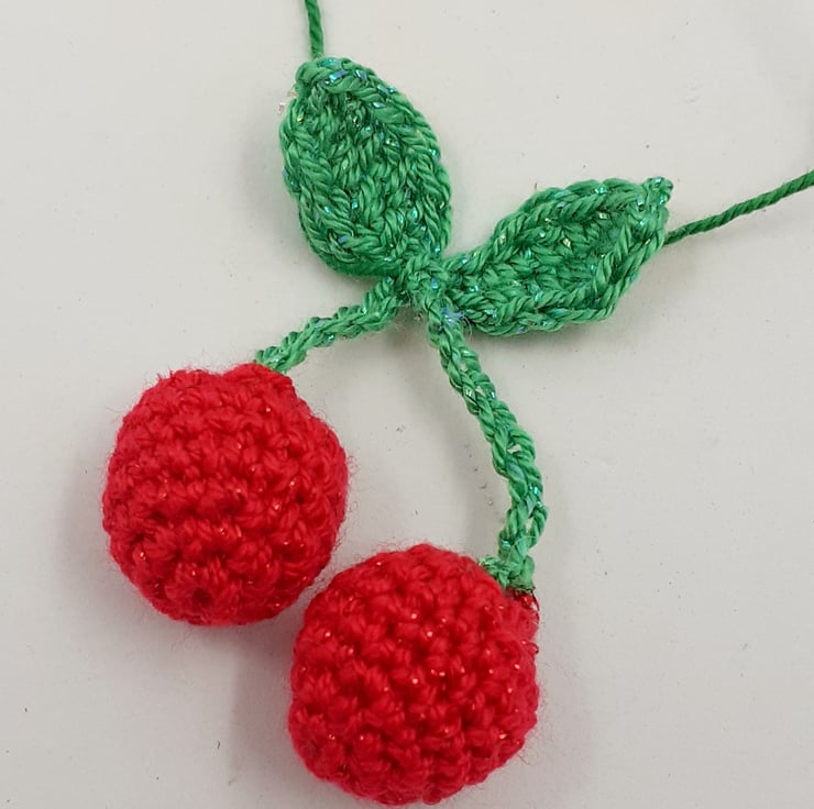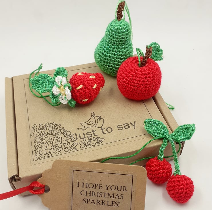 These dainty tree decorations are crocheted in a subtly sparkly cotton yarn in apple green and cerise. They are filled with polyester stuffing and have fine cotton hanging loops. They measure between approximately 5.5cm ( the pear) and 4cm ( the apple). The tag included in the box reads ' I hope your Christmas Sparkles ' although I am very happy to exchange this tag for one with wording of your choice. The decorations and tag would make a novel alternative to a Christmas card this year and pretty tree decorations for many years to come.