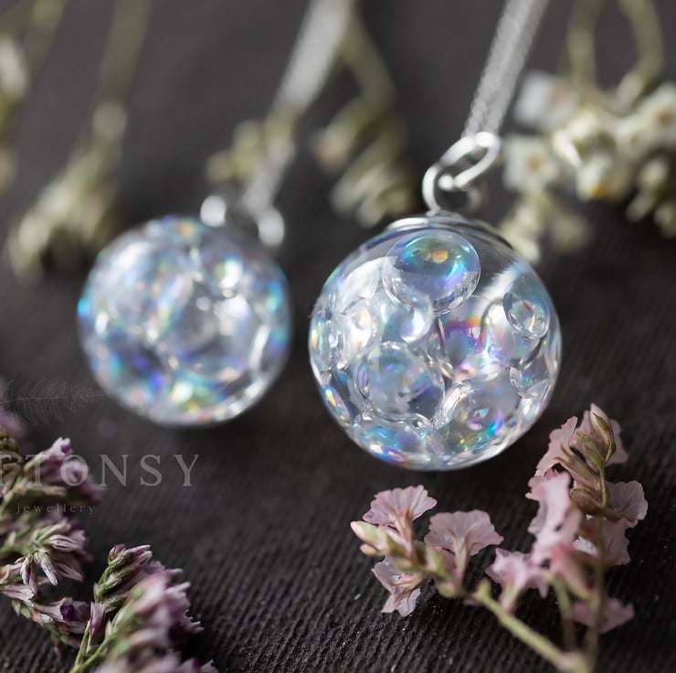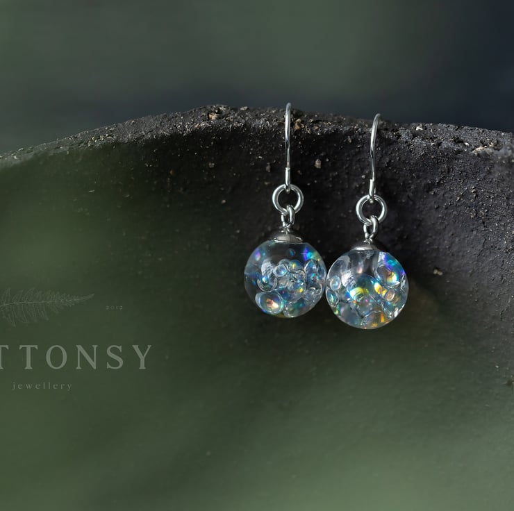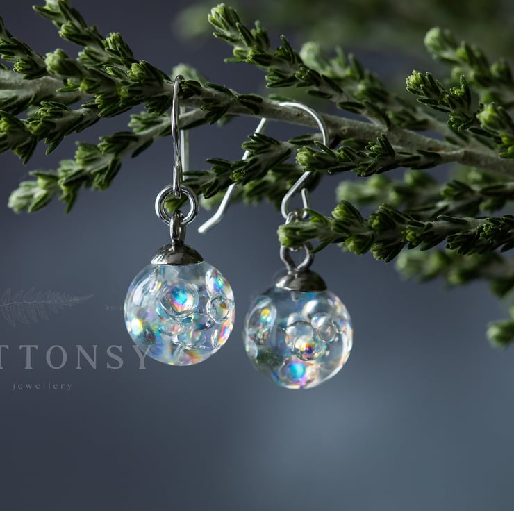 A wonderful pair of globe earrings full of iridescent bubbles... beautiful, beautiful rainbow bubbles that change colour as they catch the light from different angles; the bubbles are swirling throughout the necklace, all different sizes, like they've just been blown. We have captured something as fleeting as bubbles, and made them keepable for always. They have been made to match our bubble globe necklace.