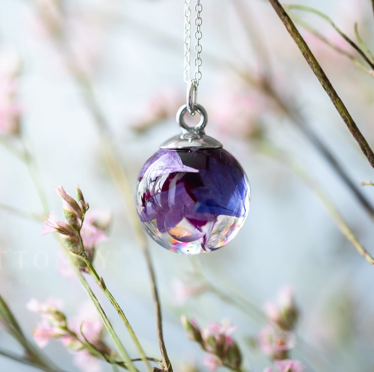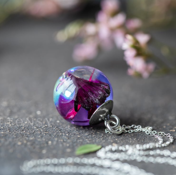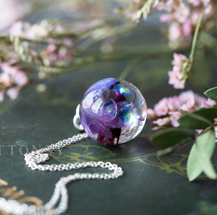 A wonderful globe full of iridescent bubbles paired with beautiful peacock-toned cornflower petals... beautiful, beautiful rainbow bubbles that change colour as they catch the light from different angles; the bubbles are swirling throughout the necklace, all different sizes, like they've just been blown. We have captured something as fleeting as bubbles, and made them keepable for always.