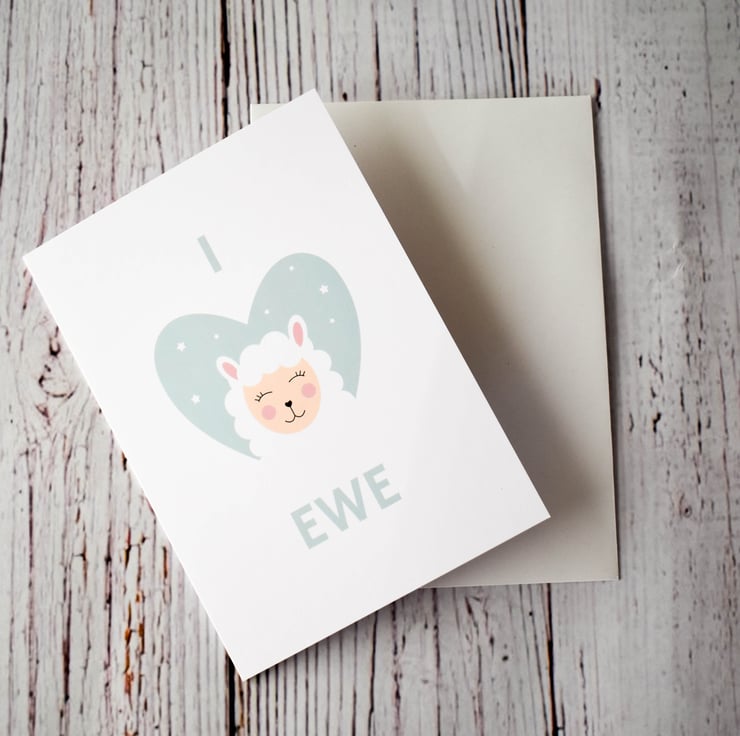 1 x I 'Heart' Ewe card featuring a cute sheep in a mint green heart with coordinating text