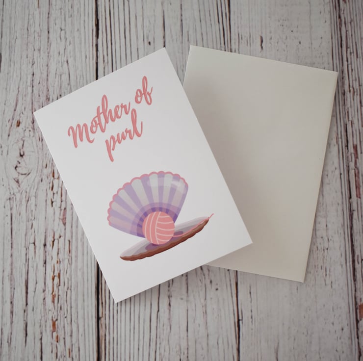 1 x Mother of Purl card featuring a clam shell holding a ball of wool "pearl" and coordinating text. Perfect for someone with a love of knitting.