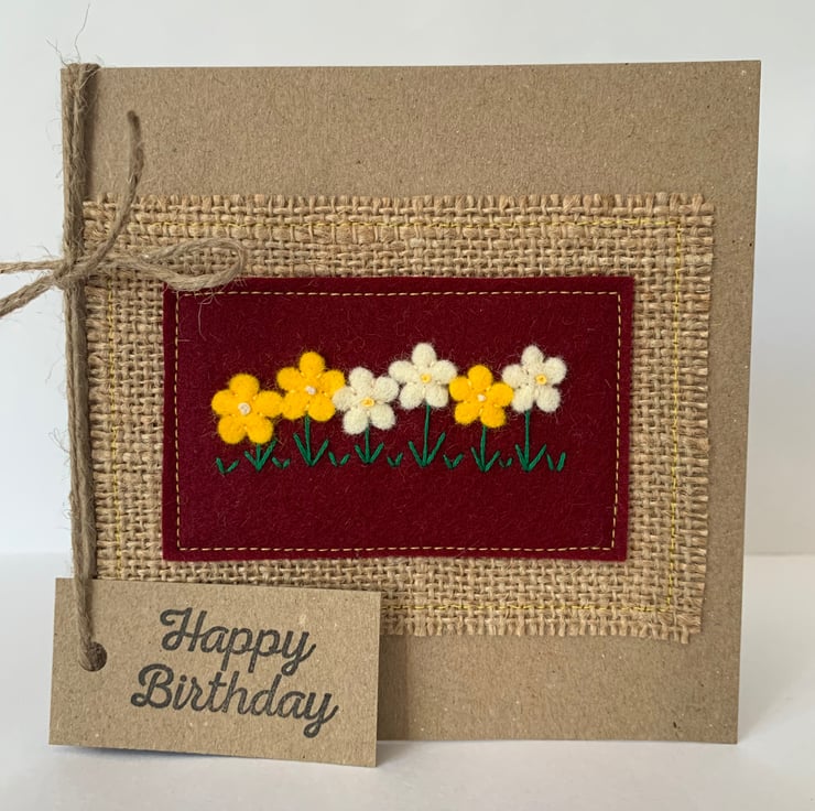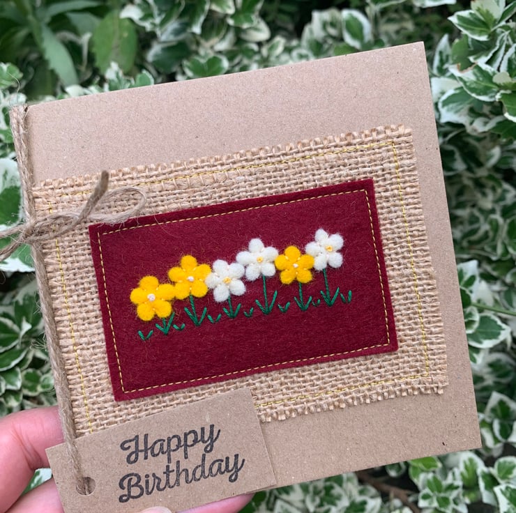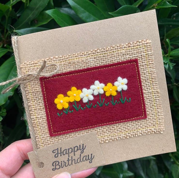 This handmade birthday card is decorated with flowers in bright yellow and cream on a deep red background. The decoration is hand cut from 100% wool felt and sewn by hand.
