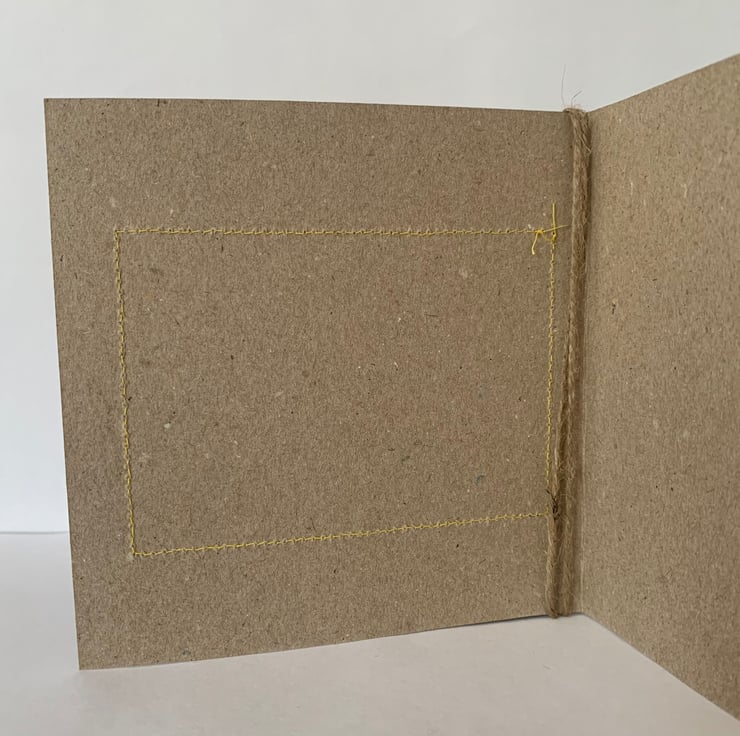 The hessian is machine stitched, using a contrasting thread, onto a plain brown recycled card. This stitching is visible on the inside of the card.