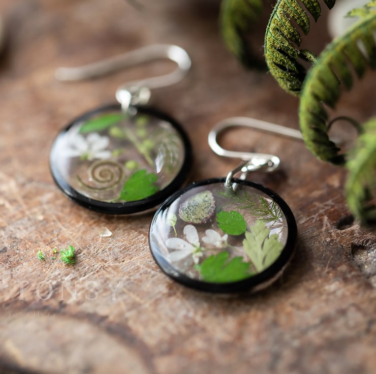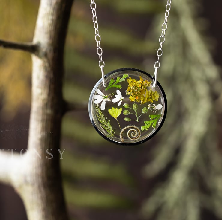 This beautiful piece of jewellery features fern, moss, coriander, dill, lichen, Queen Anne's Lace and a myriad others depending on the season.