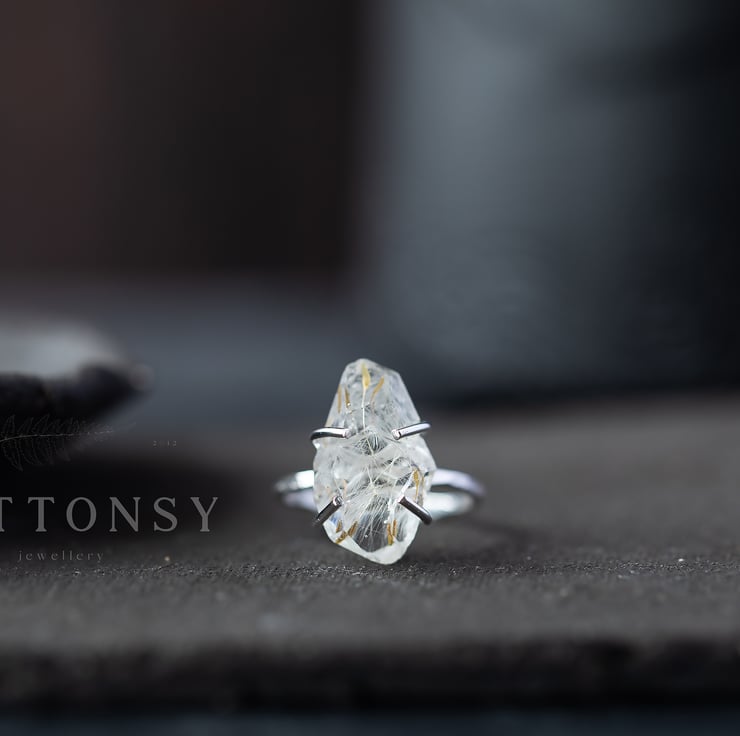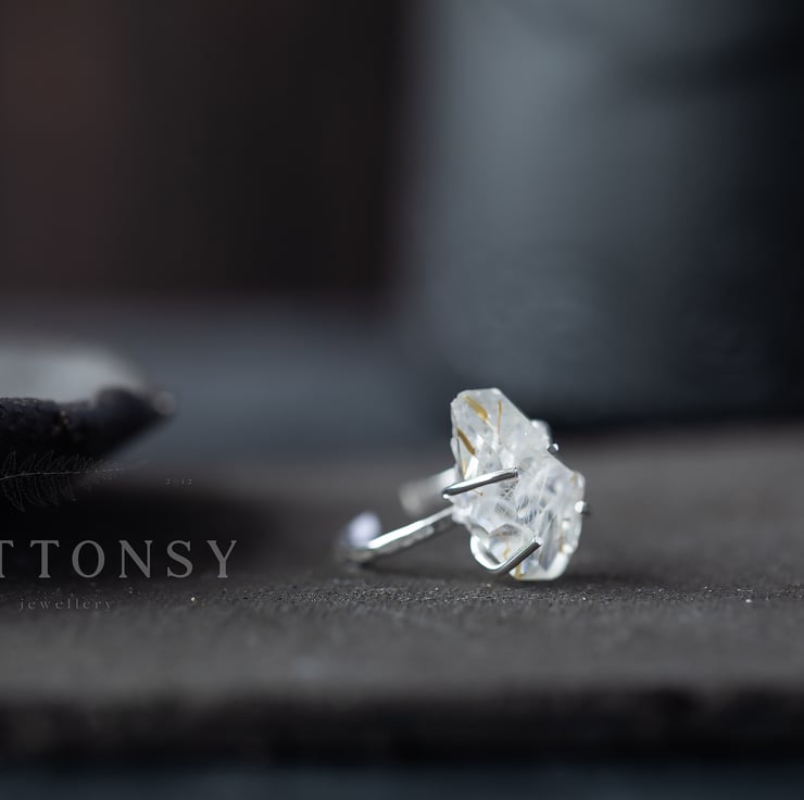 A hammered sterling silver band, ultra-skinny, perfect for stacking, topped with a perfect, large "raw Herkimer diamond" filled with perfect dandelion wishes. This is a magical piece of jewellery... it's so beautifully delicate, and each is an absolute one of a kind.