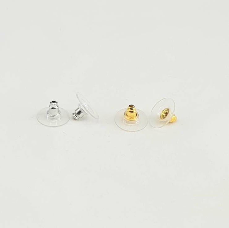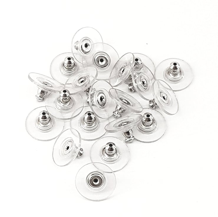 20 clear plastic earring backs, plastic comfort discs with bright silver surgical steel