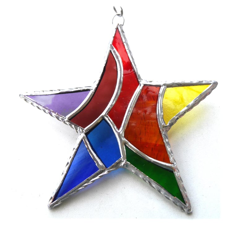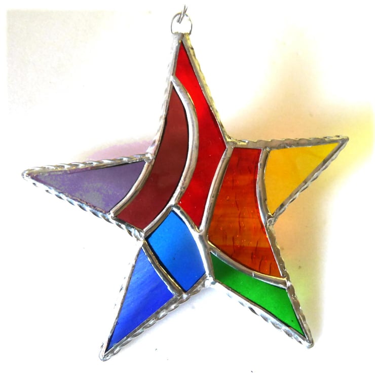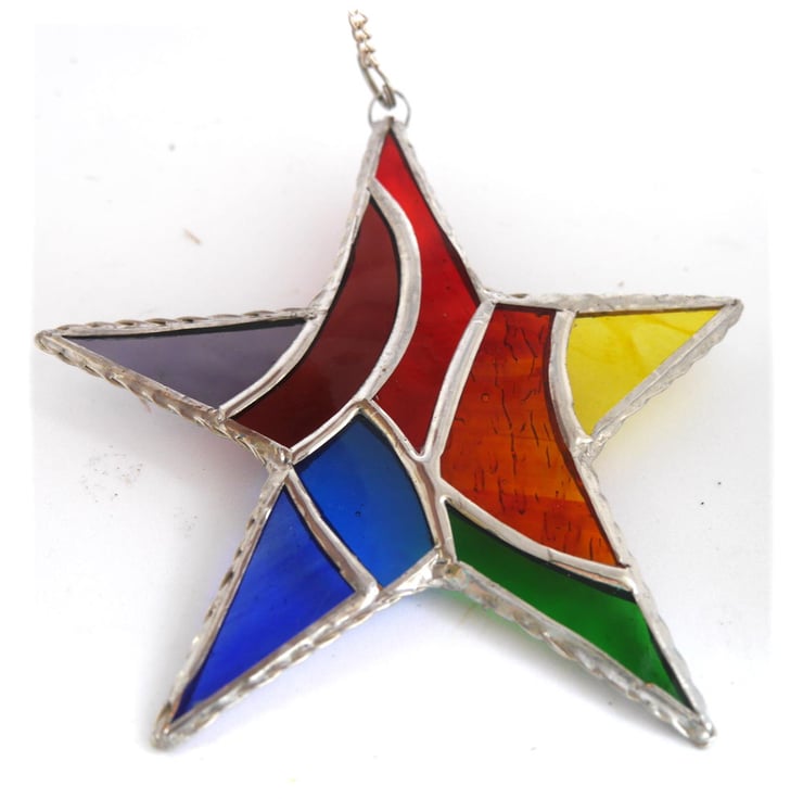 The star is 13 cm in diameter and hangs from a silvery chain attached via a soldered wire ring to the top of the star. I supply it with a suction pad so you can hang it in the window.