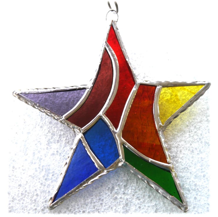 I've designed it as a pentagram, a 5 point star which is patchworked into lots of differently shaped pieces in all different types and shades of Rainbow glass.