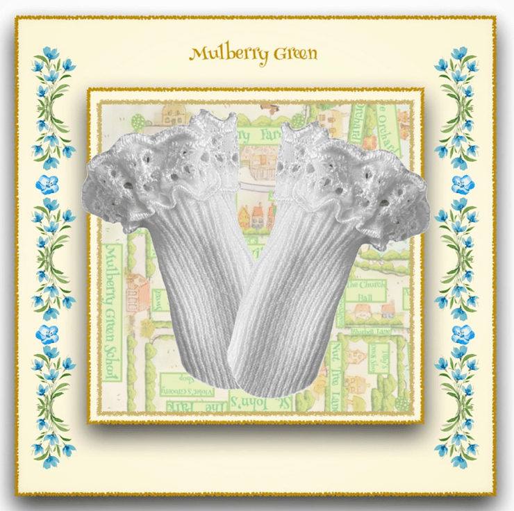 A cute little pair of lace topped white ankle socks to fit the Mulberry Green characters. The socks look lovely with the little felt shoes.