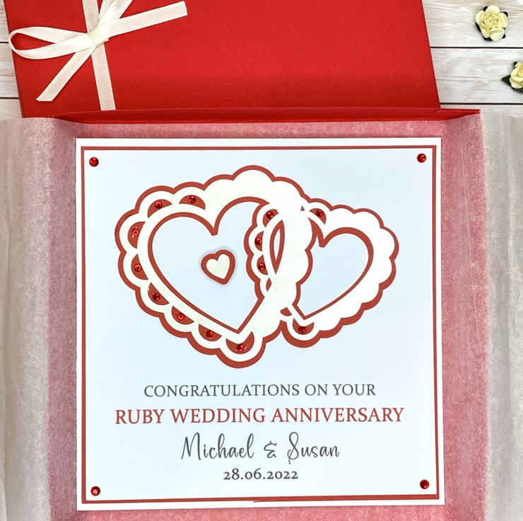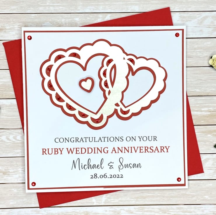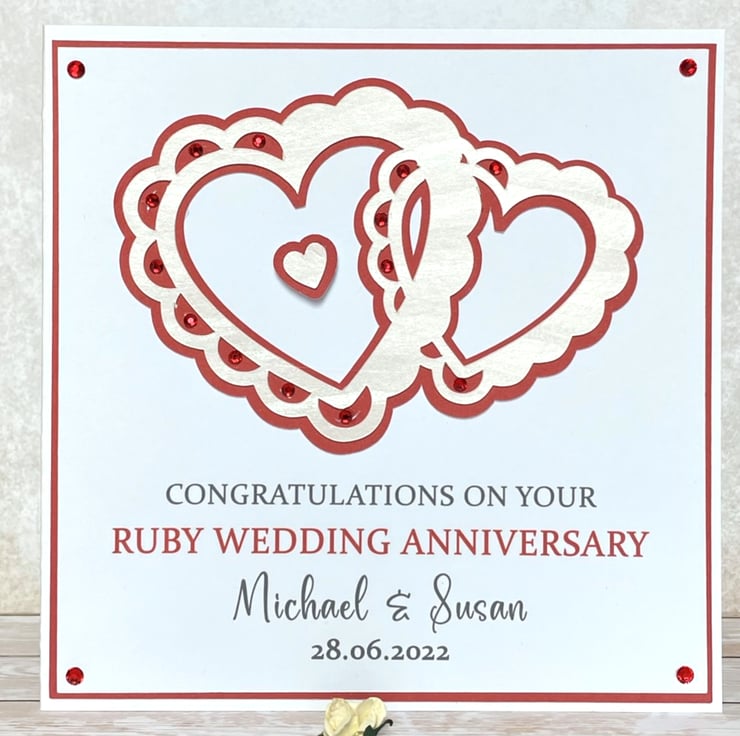 A personalised handmade Ruby Wedding Anniversary card, perfect for any couple celebrating forty special years of marriage.