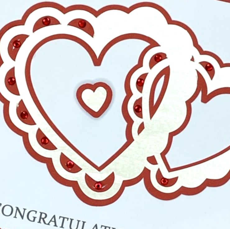 The design features two entwined hearts cut decoratively from champagne silver pearl card. The lacy detail reveals a ruby red matt behind them, which has been filled with red gems.