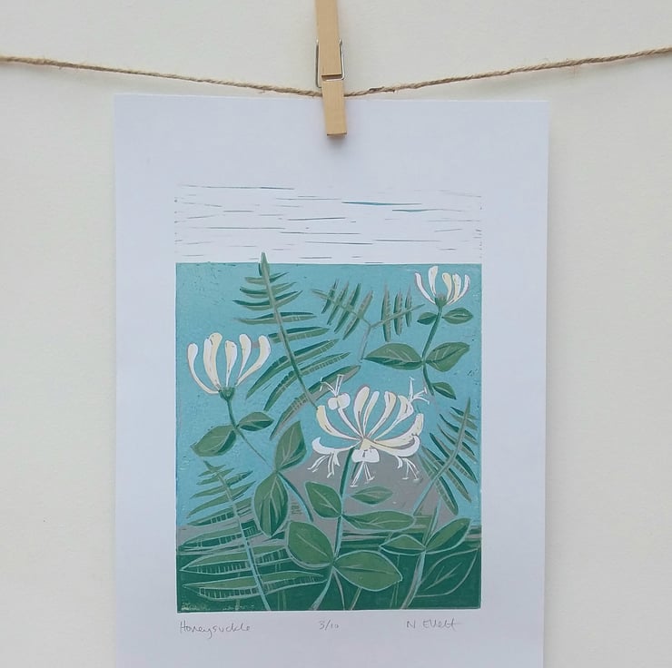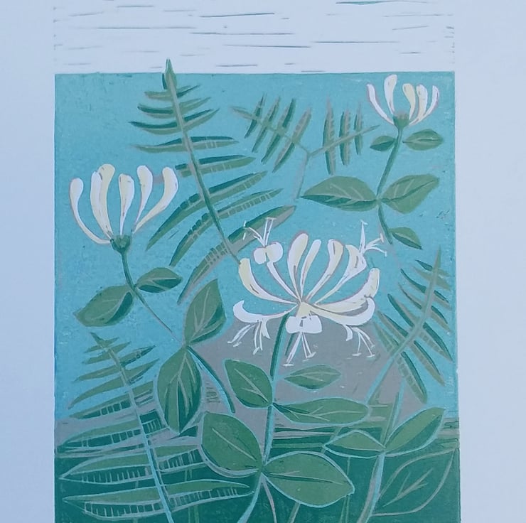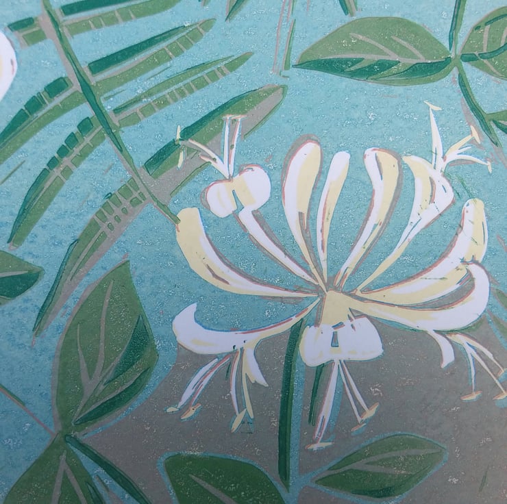 'Honeysuckle' - a 5 colour reduction linoprint in blues and greens on white.