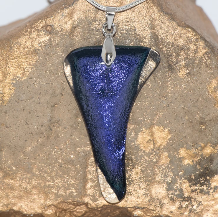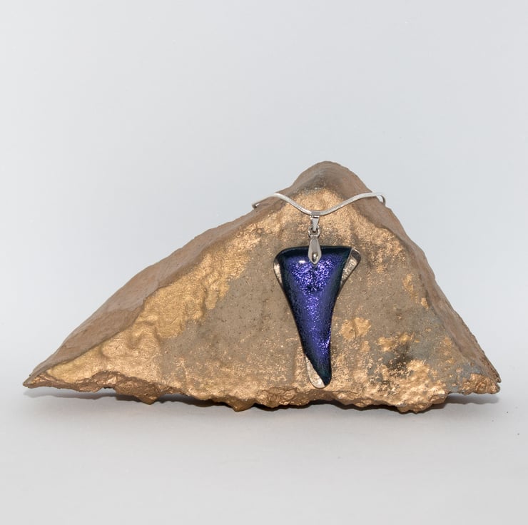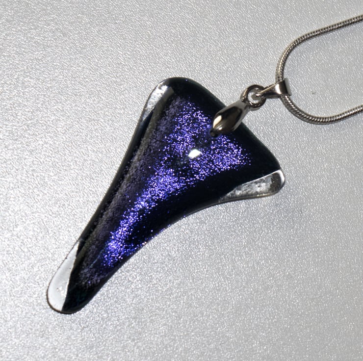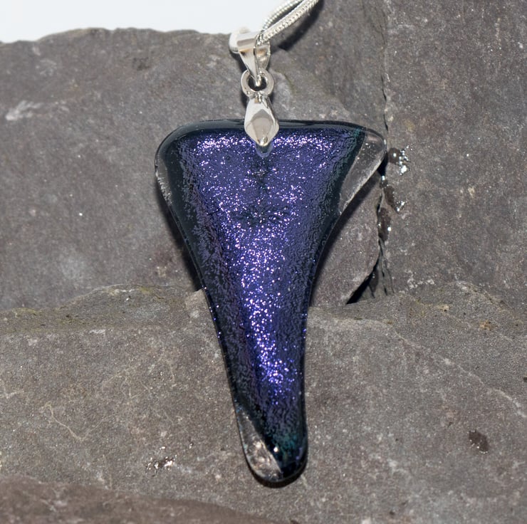 Constructed from a triangle of hand-cut dichroic glass capped with a similarly shaped piece of clear glass, this pendant spent 12 hours in the kiln to achieve its basic shape and texture. Once cool it has been carefully drilled and the pinch bail fitted and the chain strung. Because the glass is hand-cut this piece is unique.
