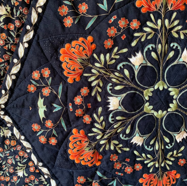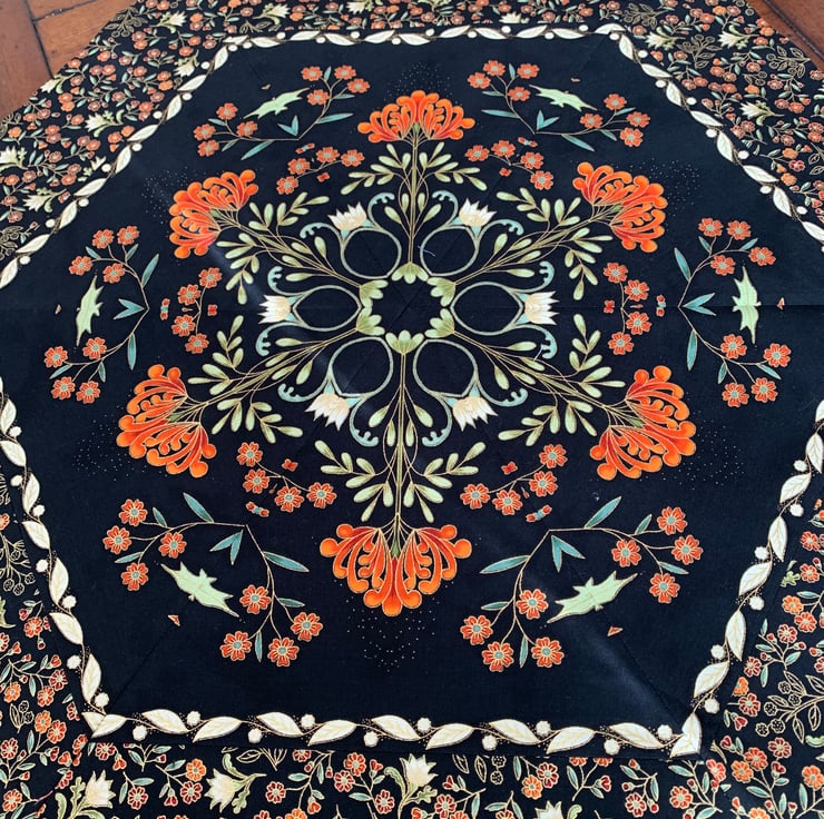 I find kaleidoscopic quilts fascinating. It’s the cutting that transforms a patterned fabric into something completely different. You never quite know what will appear and the results are always beautiful.