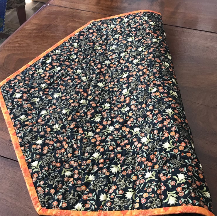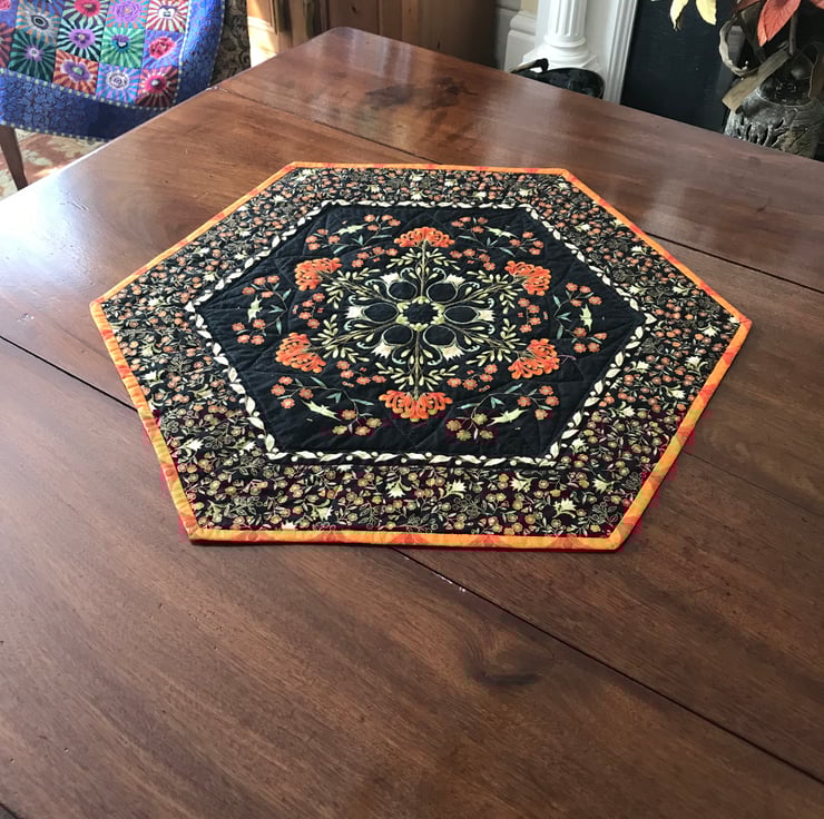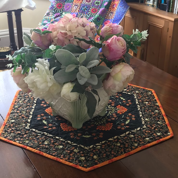 A hexagonal quilted textile table topper.