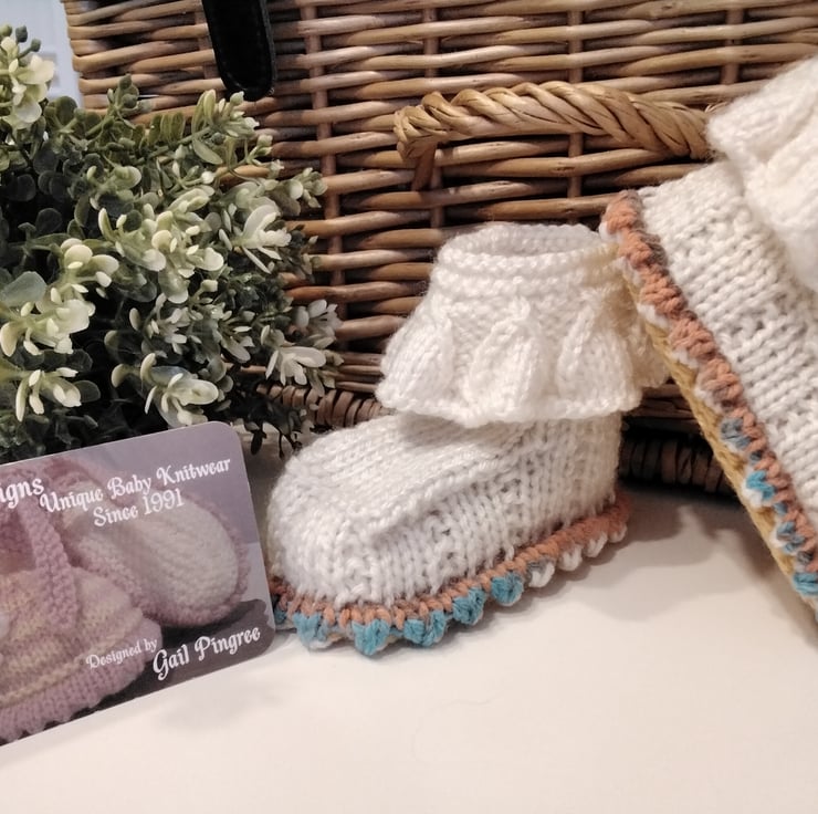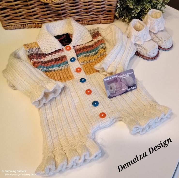 This adorable eye catching snuggly baby girl's rompers and booties set has been designed and lovingly hand crafted in Cornwall using quality British branded designer yarns. The yarns have a super soft touch. The gusset has been shaped to accomodate a baby's nappy for total comfort during wear. There is a ruffle edge at the top of the legs and bottom of the sleeves. The set can be machine washed at low temperature settings. On the inside back neck edge is the designer garment label with the care instructions woven on the reverse side for lasting reference. The booties have been designed to match the rompers to compliment the rompers. The Demelza Designs garment swing tag will be attached to the front as proof of it's designer origins if gifting.
