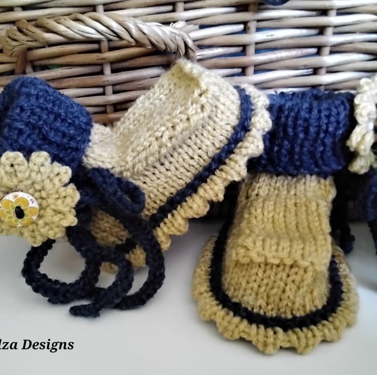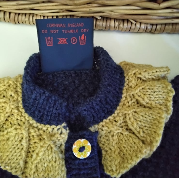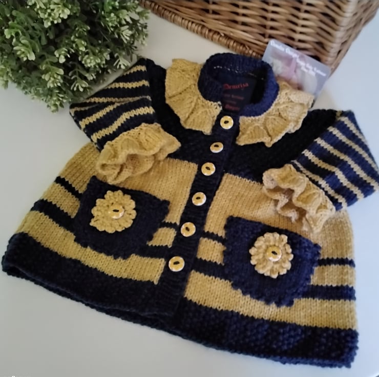 A beautiful practical baby dress totally hand crafted in Cornwall. The design is based on a bumble bee. I have created the garments using quality branded machine washable super soft acylic yarns. On either front skirt sides are little pockets with hand crotched flowers. The buttons have a delicate flower design on them and made from genuine wood. This little unique knitted dress and booties set will be much admired when worn by a baby and ideal for cold autumn and winter months for daily wear, especially as heating costs rise. Any mother whom appreciates quality designer baby clothes would be thrilled to receive it as a gift for her baby, knowing other mother's would not have the same.