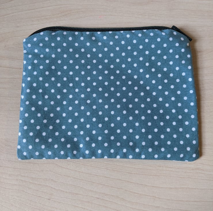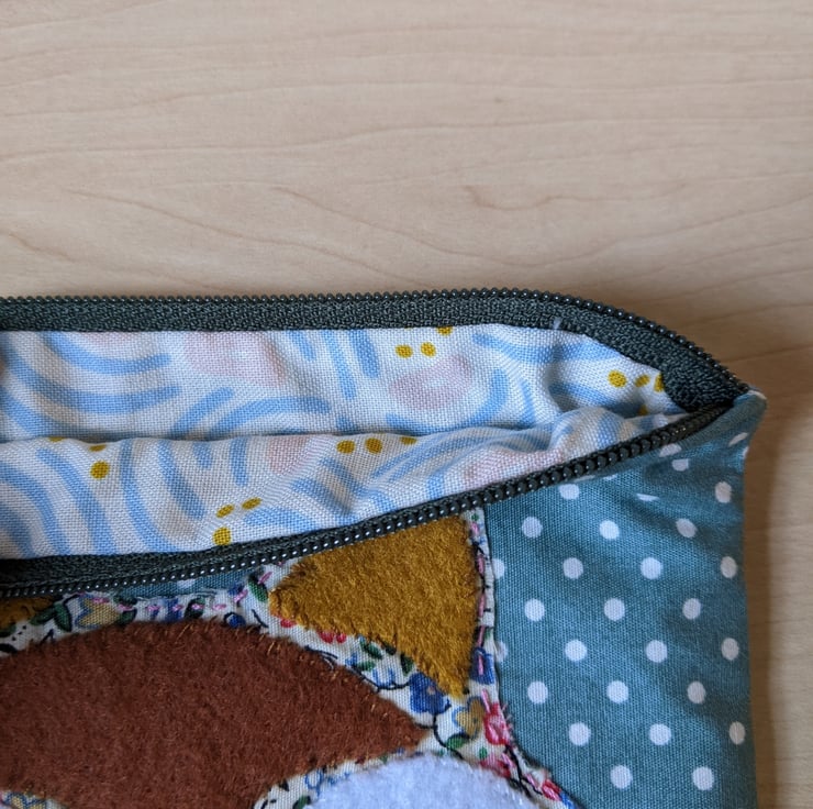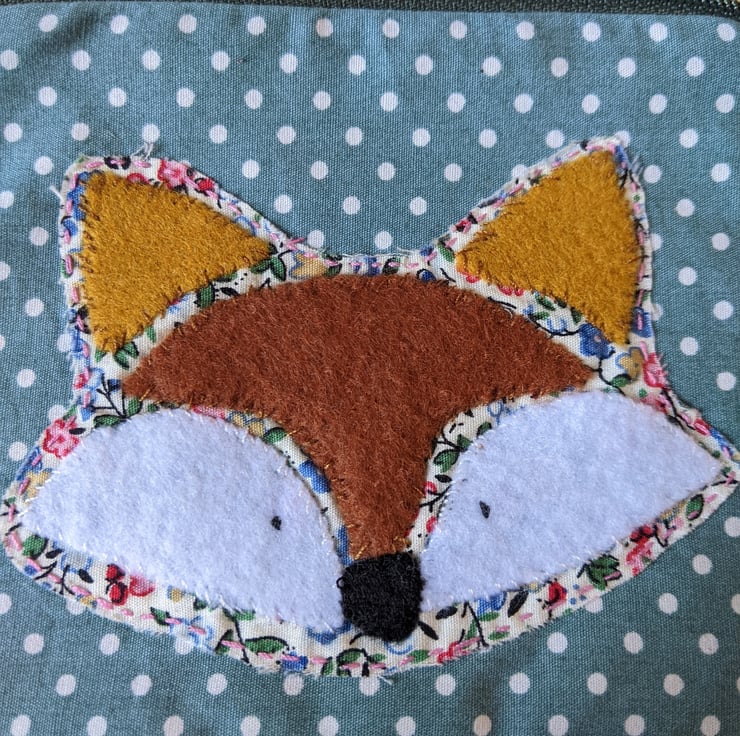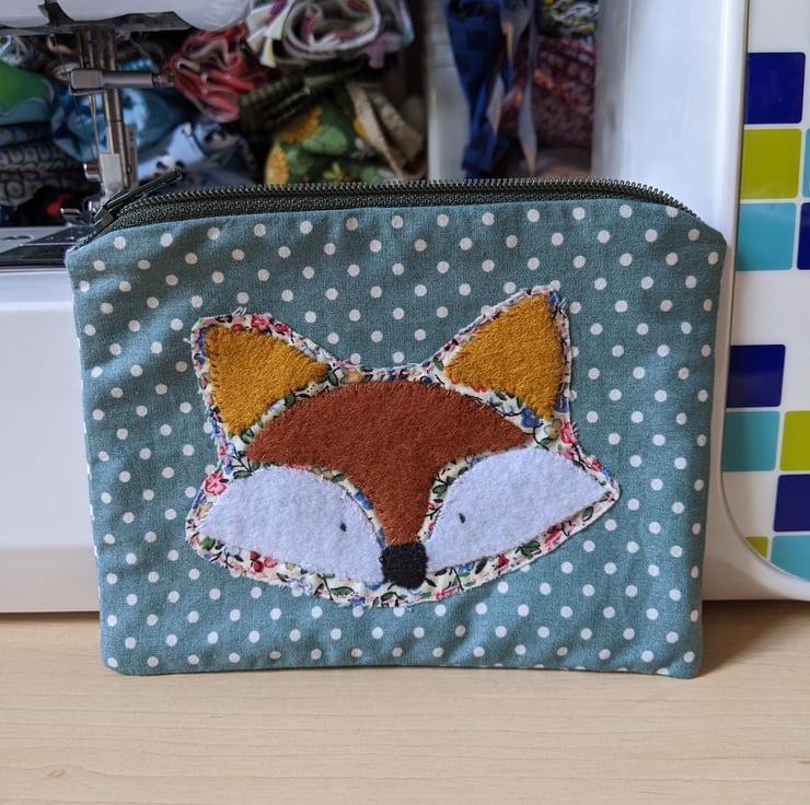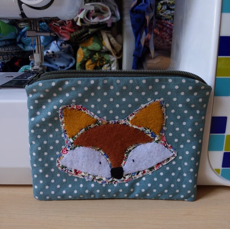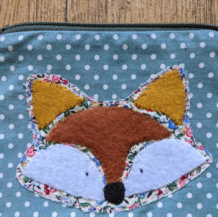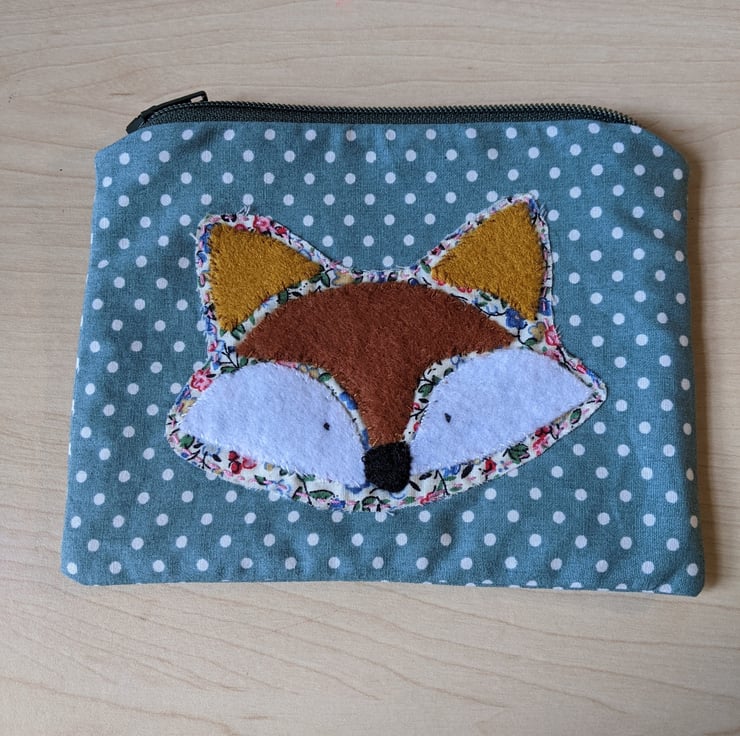 Fully-lined handmade fox hand-appliquéd coin purse with dark green zip and abstract pastel lining. The main fabric is a teal polka dot 100% cotton and the appliqué fox is backed with a ditsy floral cotton with brown and white felt overlays hand stitched in place.