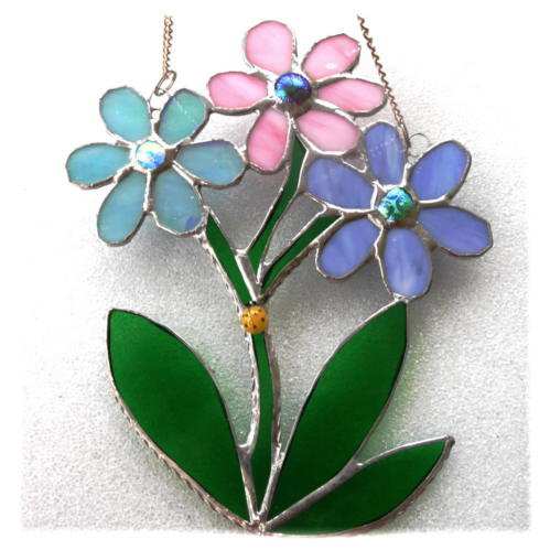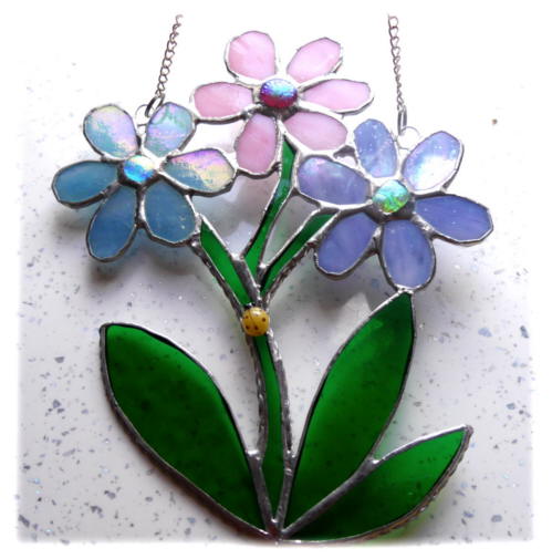 At the centre of each flower is a little dichroic glass nugget, all different , which I fused in my kiln and they give an extra special shine to the flowers.