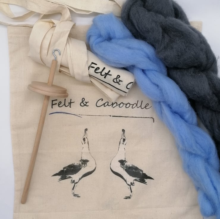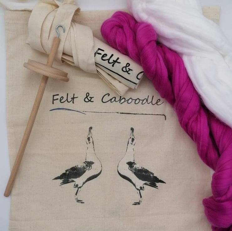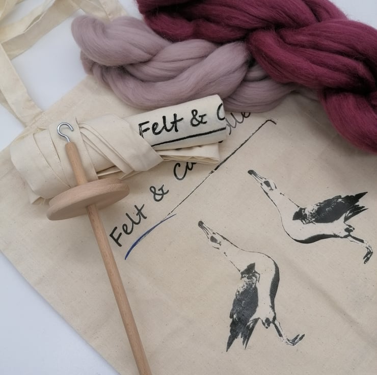 This kit includes a drop spindle, 150g of wool, instructions and a reuseable eco tote bag.