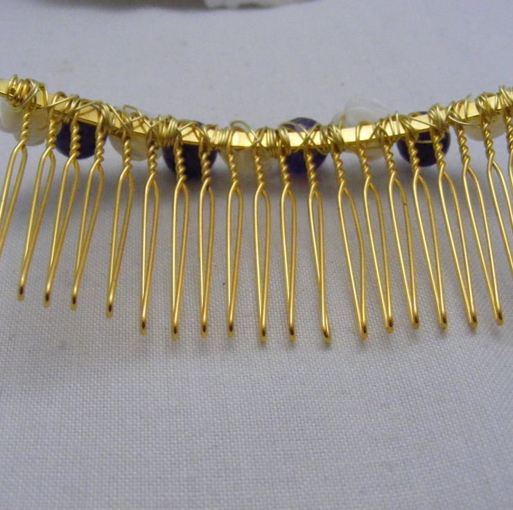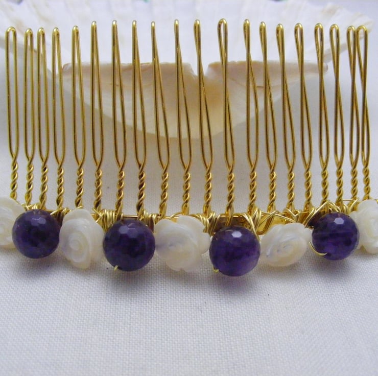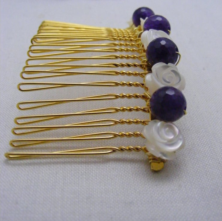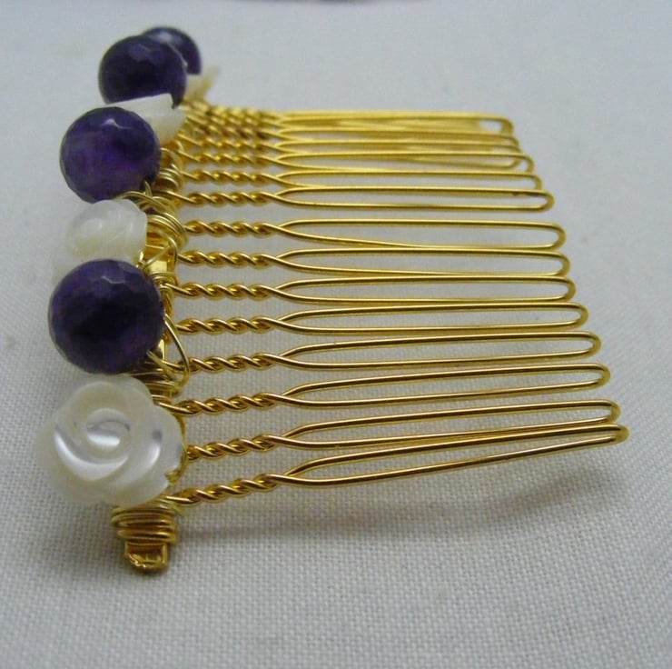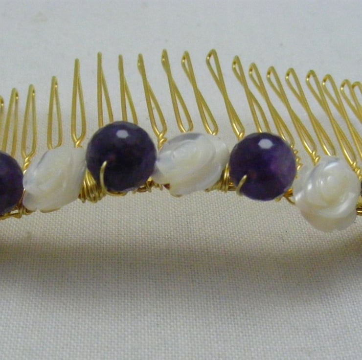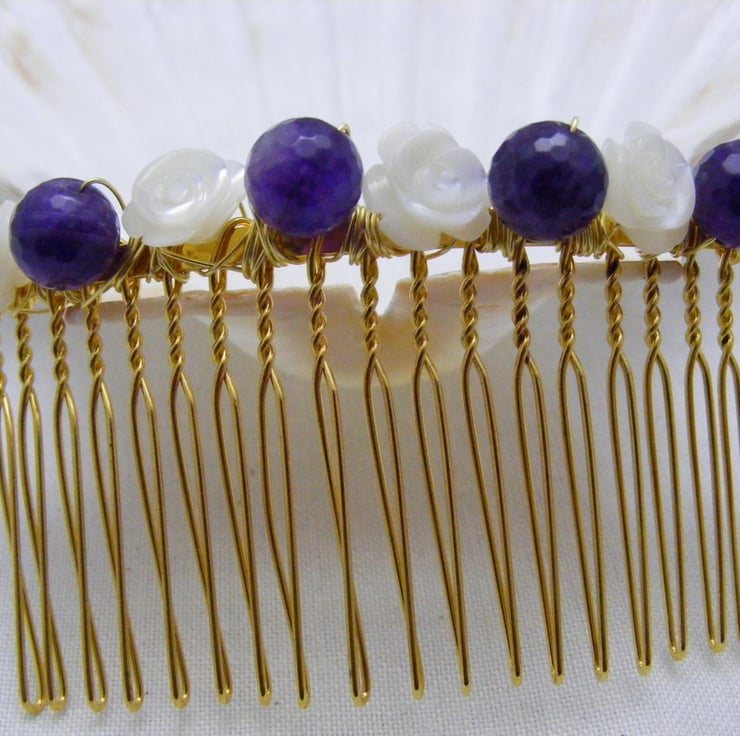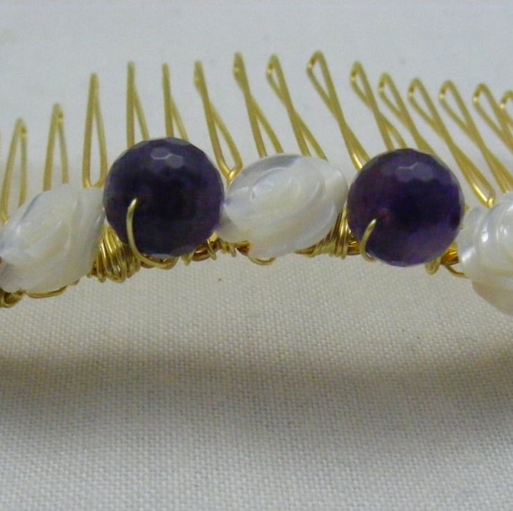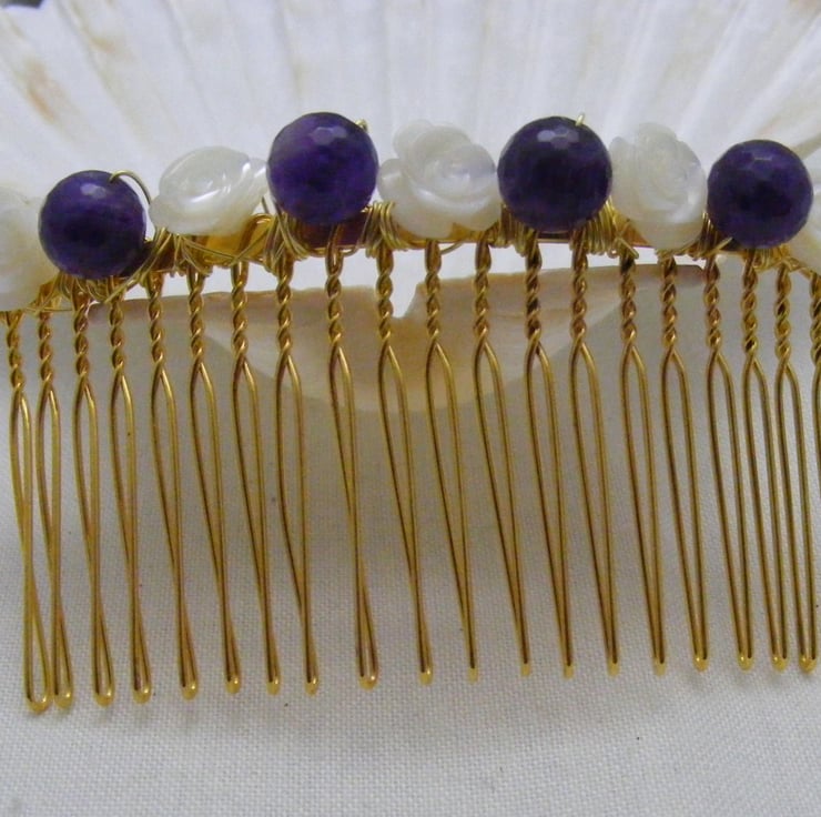 Comb is handmade with, 78x35mm gold plated comb, 7mm amethyst faceted gemstones, 12mm mother of pearl rose flowers and gold plated wire.