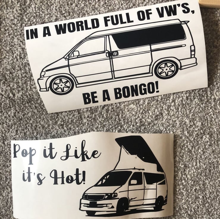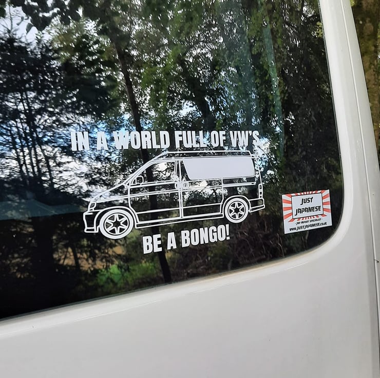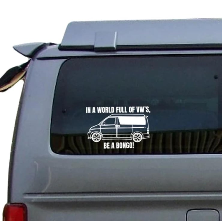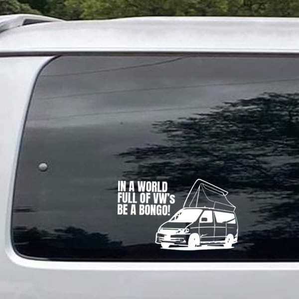 These decal are made with permanent matt vinyl which is available in a range of colours. The decal features the words 'In the World full of VW's be a Bongo!' including an image that can match your Bongo van. The sticker is approximately 20cm in length and 10cm in height. Our Matt Finish vinyl is durable, waterproof, flexible and has an acrylic removable adhesive making it suitable for indoor and outdoor projects.