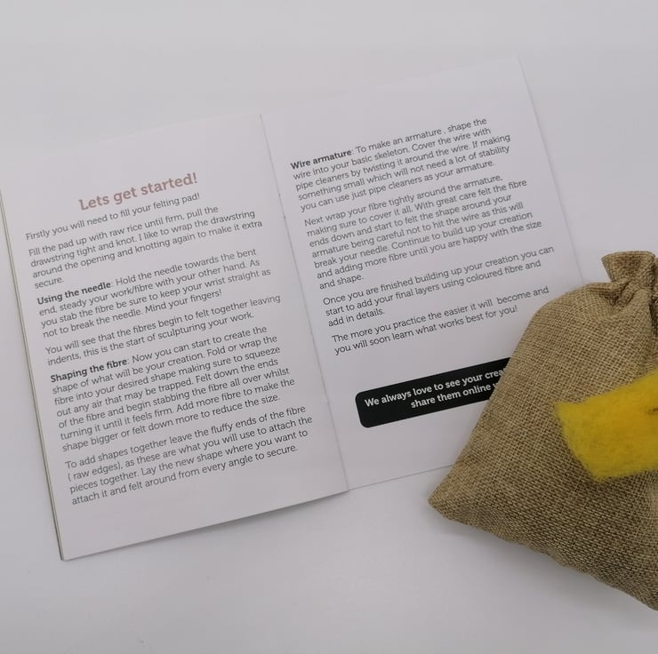 Your reusable box will include a selection of fibres and also included are 2x felting needles, a Eco felting matt, 2x pipe cleaners and an instruction booklet.