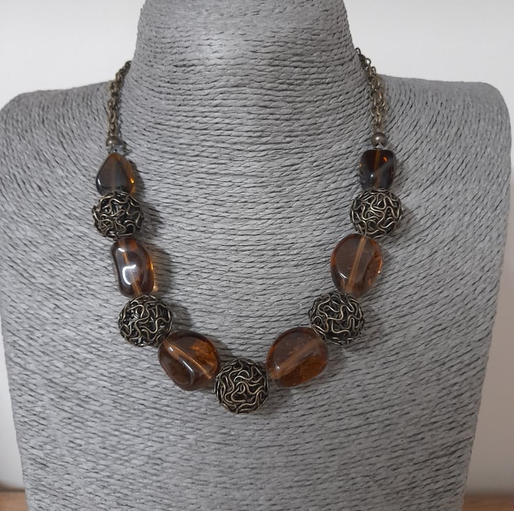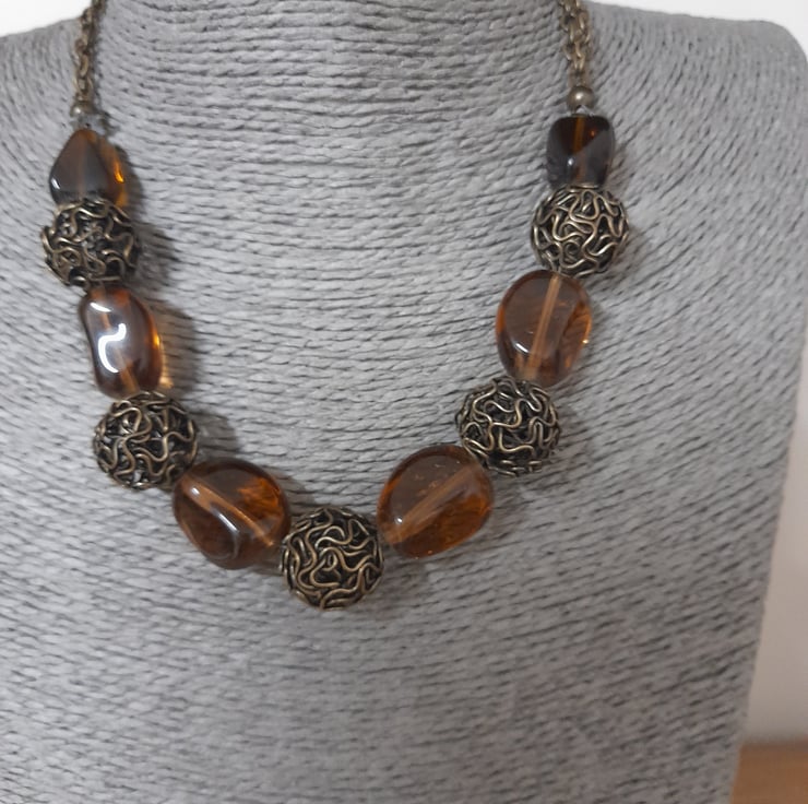 THE NECKLACE HAS BEEN MADE WITH LARGE ANTIQUE BRONZE FANCY WIRE BALLS, LARGE BROWN GLASS NUGGET SHAPED BEADS ALONG WITH ANTIQUE BRONZE FANCY BEAD CAPS, ANTIQUE BRONZE SPACER BEADS AND FINISHED WITH ANTIQUE BRONZE TRACE CHAIN AND LOBSTER CLASP. ALL FINDINGS ARE NICKLE FREE.
