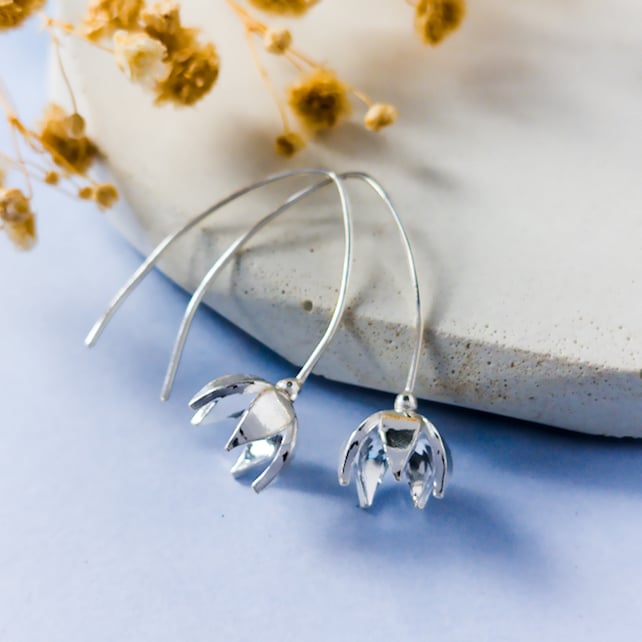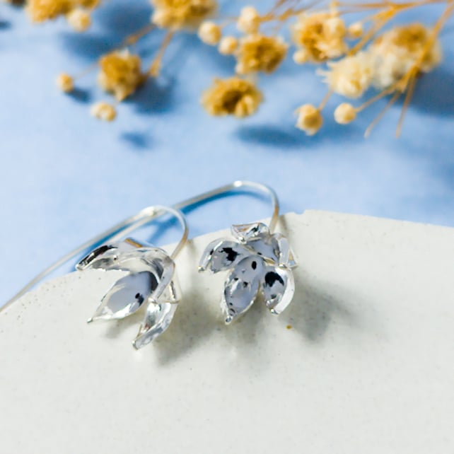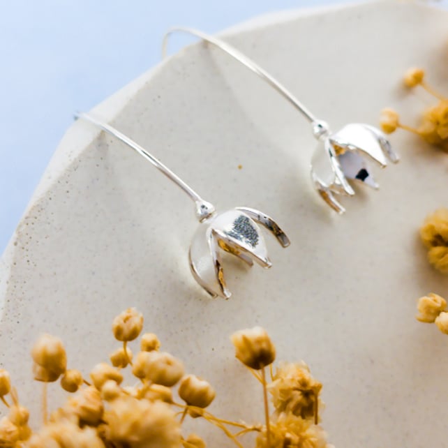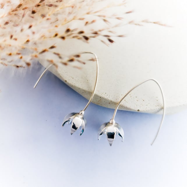 Gorgeous flower drop earrings in recycled sterling and fine (99.99%) silver. The flower head is first shaped by hand in fine silver and I have then soldered a stering silver stem ear wire onto the flower. They are really light and easy to wear, and have a beautiful shine.