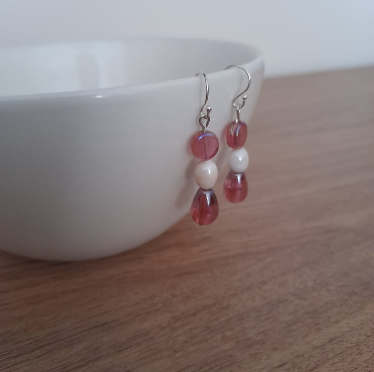 THESE UNIQUE GLASS EARRINGS HAVE BEEN MADE USING SHADES OF PINK PEAR SHAPED GLASS BEADS ALONG WITH SMALL PEARLY PINK DISC BEADS AND OVAL PEARLY WHITE OVAL GLASS BEADS AND FINISHED WITH SILVER PLATED FISH HOOK EAR WIRES.