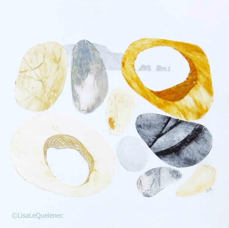 An original collagraph monoprint with added drawing exploring shape and textures contained within the local stone - a geological record of the history of this wonderous and evolving coastline.